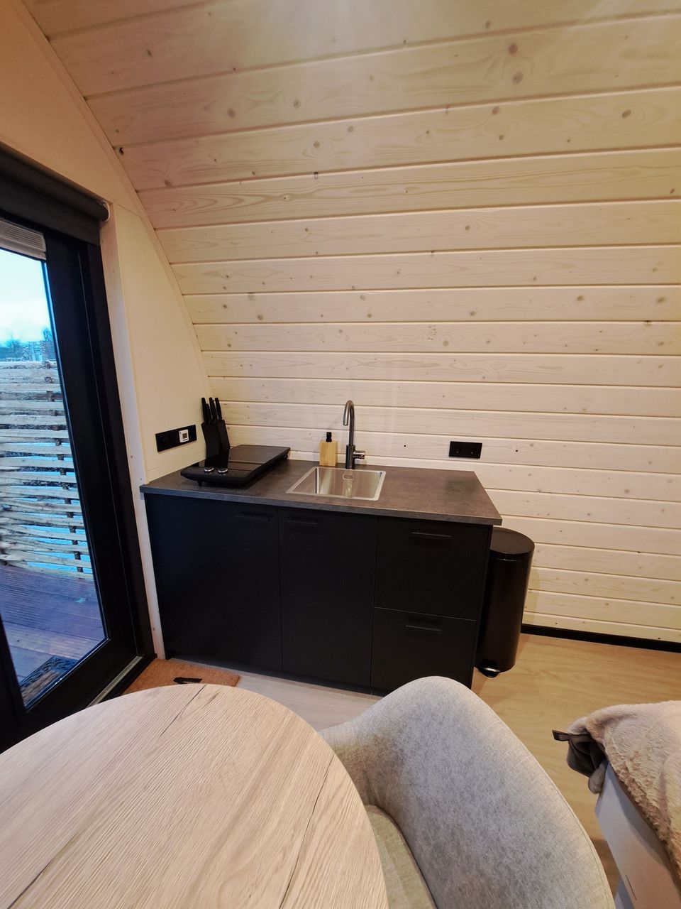 Enjoy beautiful views over the water from this cozy pod. The pod is fully furnished with a cozy sitting and dining area, comfortable double bed and a very well-equipped kitchen. This kitchen includes a refrigerator, two-burner induction hob as well as a Dolce Gusto coffee machine and kettle. The bathroom is located at the rear of the pod. This is spacious and includes a shower, toilet and sink.