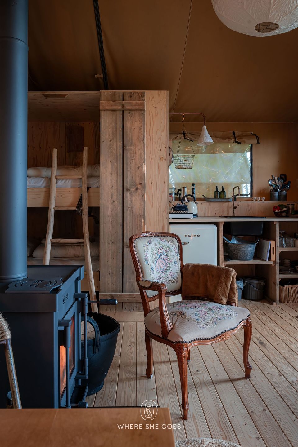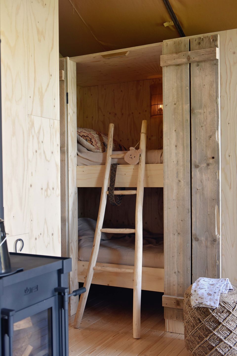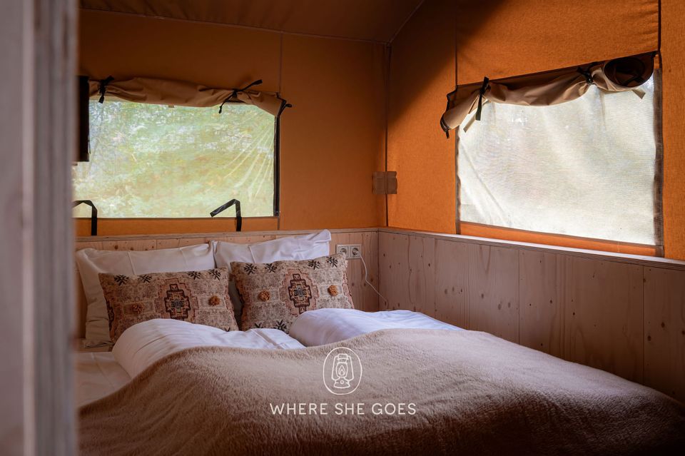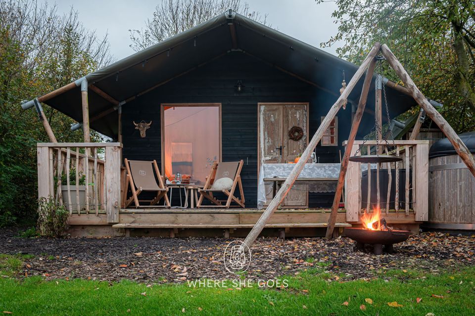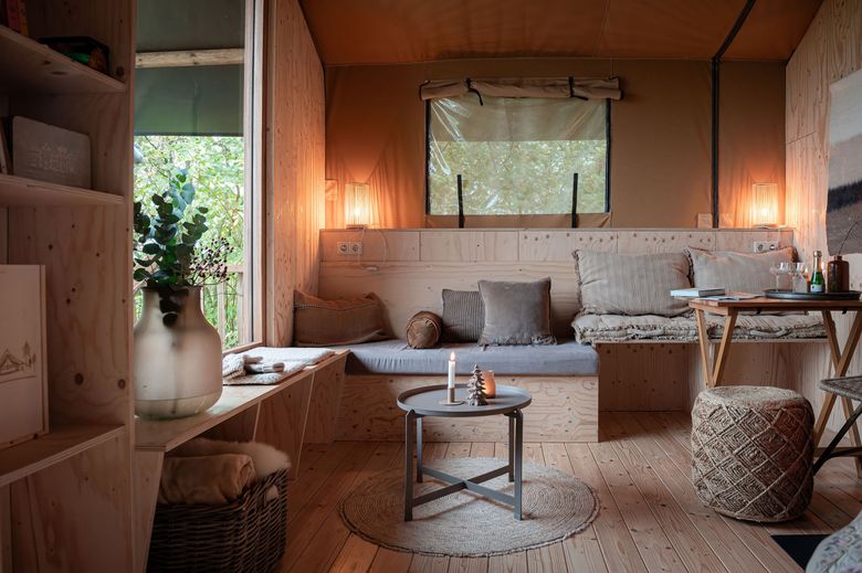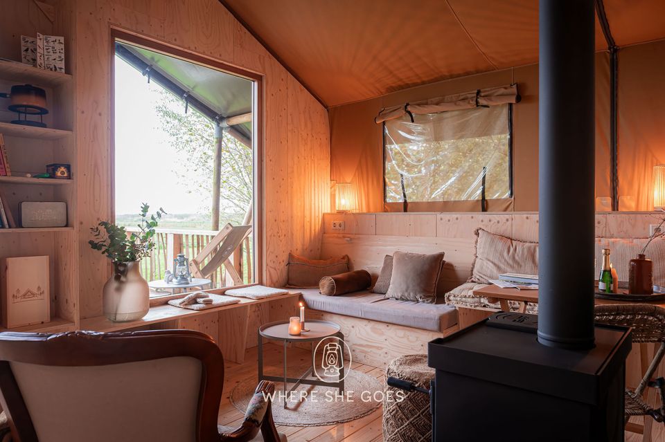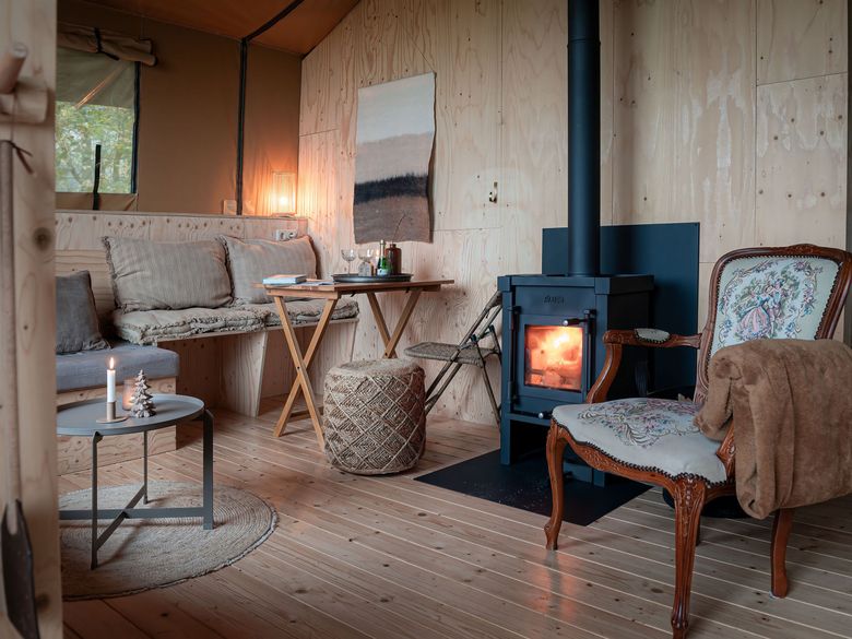 The hut accommodates 2 to 4 people and offers stunning views of the surrounding nature through a large window, with a wood-burning stove for warmth. It's bright and full of character, featuring a comfortable bed and a bunk bed. The tent includes a toilet and sink. The kitchenette includes an induction cooktop for cooking, a coffee maker, and cold water. Electricity is available. A private, "unique" outdoor shower experience with heated water. You can also use the showers in the main building. It's a unique blend of a cabin and a tent, offering the benefits of a tent, such as listening to the sounds of nature, while the wooden base eliminates drafts. A wood-burning stove provides comfortable warmth, and heated beds are available in the winter and autumn. The cabin also features beautiful, authentic French doors. A large deck with an awning and an optional hot tub are available. You can also cook outdoors over an open fire and build a campfire. Wonderful! It gets truly dark here, and you can gaze at the stars.