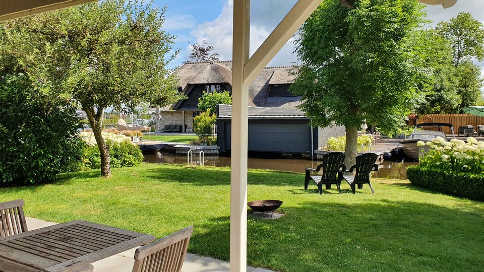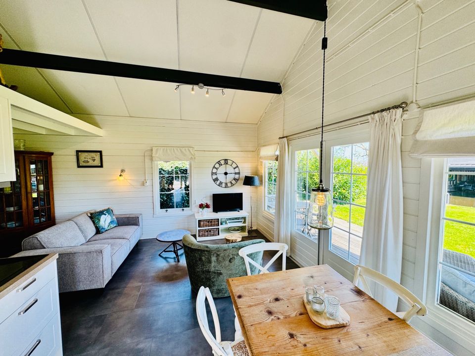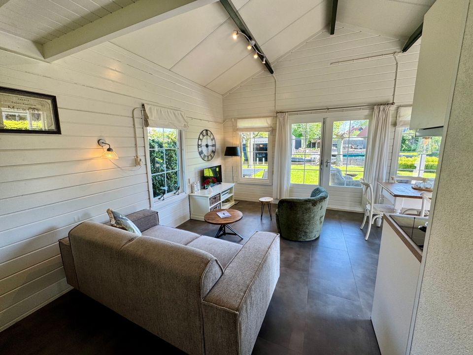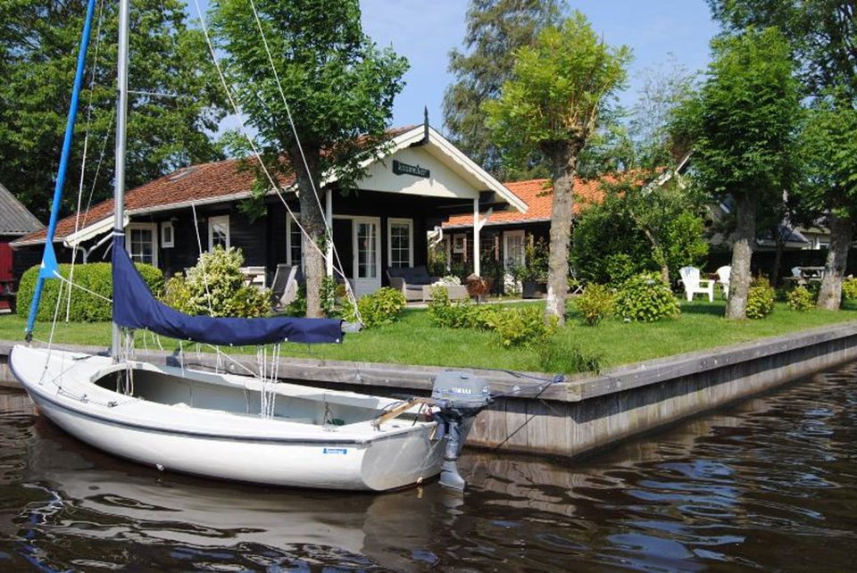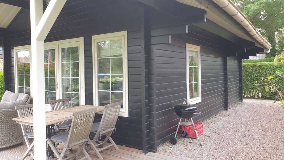 The wooden holiday home is very cosy, when you step inside you can see at a glance the small but complete kitchen, dining table and living room. The large windows and patio doors towards the garden and the water provide maximum enjoyment. There are two bedrooms in the house, one bedroom has a double box-spring bed and the other bedroom has a real box-bed! The bathroom is fully equipped with shower, toilet and sink. In the utility room there is a washing machine and you will also find a combi oven. When you step outside through the patio doors in the living room, you are immediately on the terrace. You can choose to sit in the shade here, but with the same ease you look for the sun. Or do you take a dip in the water?