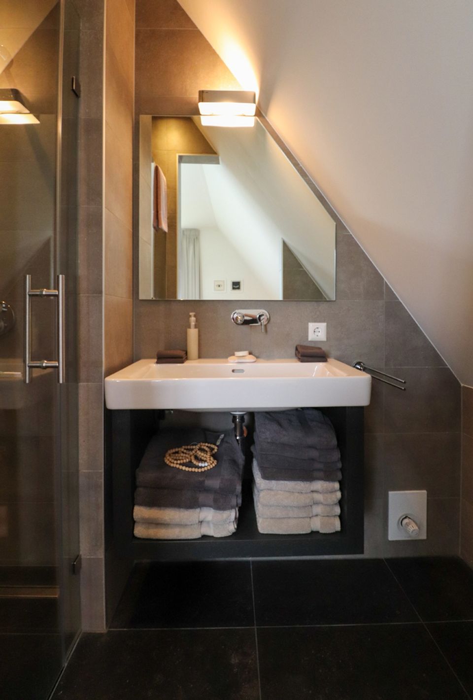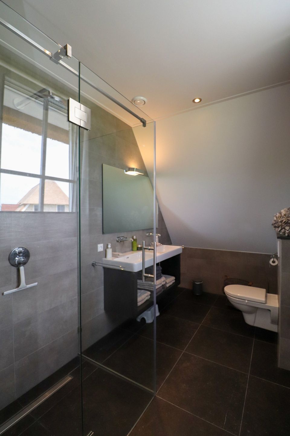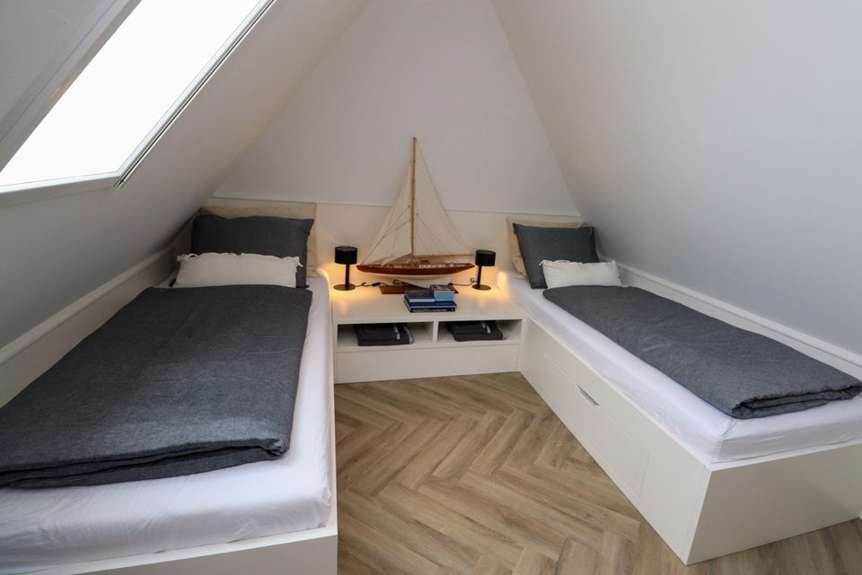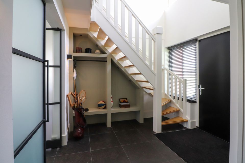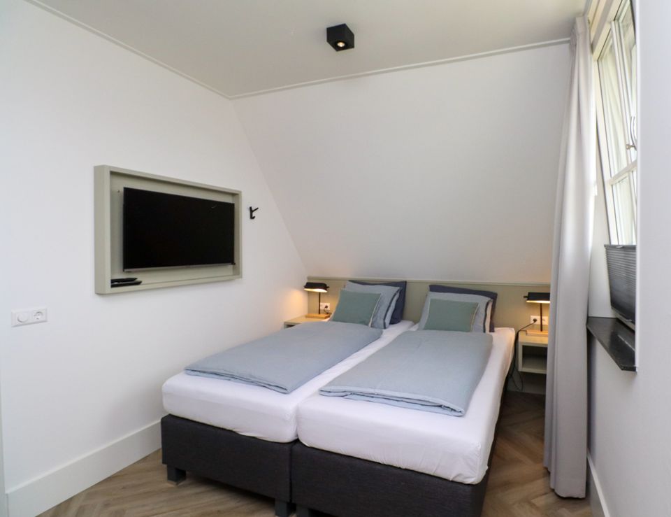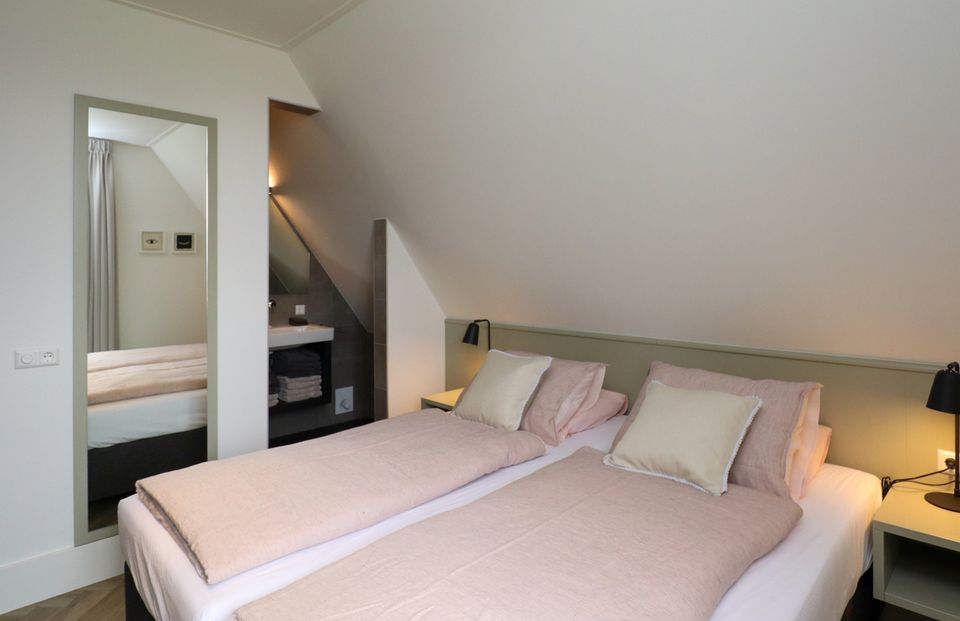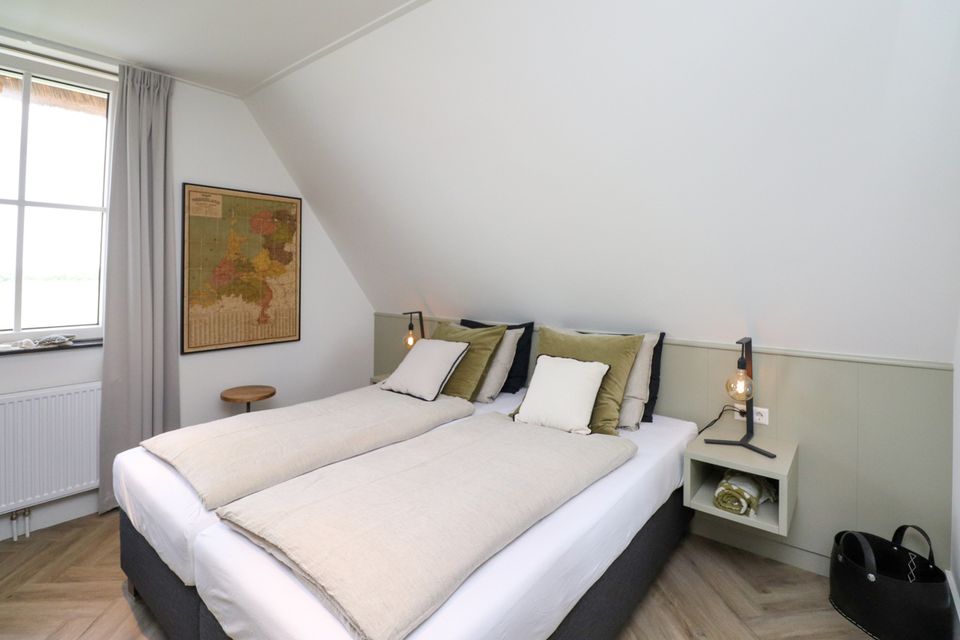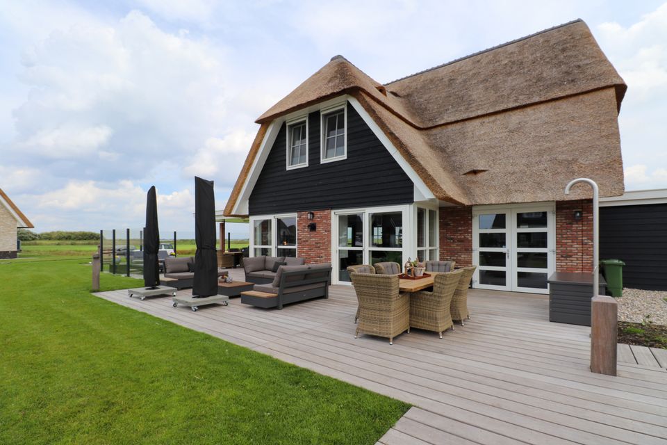 Enter this attractive family villa through the spacious hall with ample storage options. The living room has a cozy sitting area with a gas fireplace, Smart TV, workplace and Sonos sound system. The villa has a fully equipped open kitchen with a large dining table for 14 people. The attractive kitchen is equipped with a 10-burner induction hob, 2 ovens, dishwasher, blender, microwave and a fridge with freezer compartment. The kitchen island has a combi microwave, an extra refrigerator and space for two people to have a drink. There is also a bathroom with toilet and a bedroom for two people on the ground floor. This bedroom has two single box-spring beds, Smart TV, spacious built-in wardrobe and air conditioning (on request). Through the spacious sliding door you can step onto the deck terrace, where you can sit with the whole group. On the first floor of the villa you will find three bedrooms with: 2x single box-spring bed, Smart TV, built-in wardrobe, shower with toilet and double sink. The fourth bedroom is a family room with two single box-spring beds, a baby cot, changing table, Smart TV and fitted wardrobes. On the landing of the first floor there is a Finnish sauna, spacious bathroom with shower, toilet and double sink. There are two more bedrooms on the third floor of the villa. Outside around the villa you can relax on the terrace (south) with furniture, parasols, sunbeds and lounge set. You also have access to your own Jeu de boules court, lowered jetty for fishing or swimming and an outdoor shower. There is a picnic table right on the water, to fully enjoy the view.