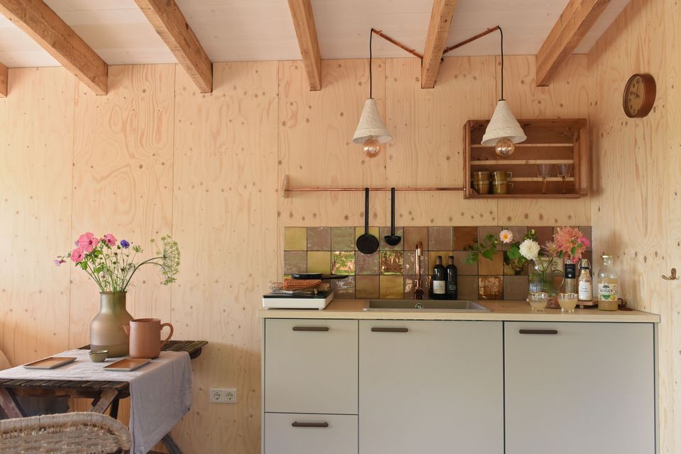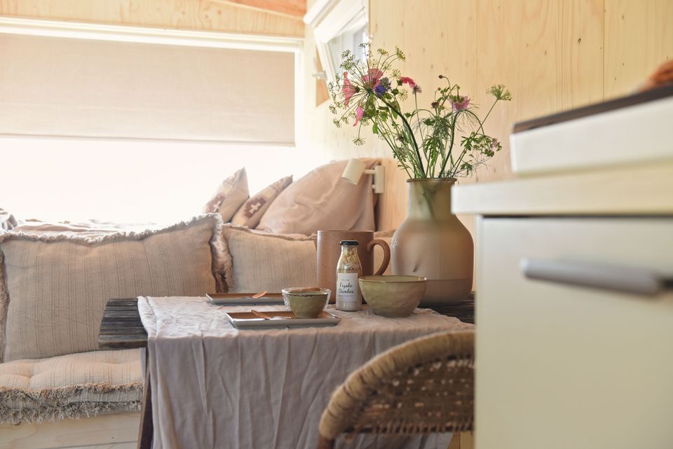 You can use the private hot tub at the Smûk Tiny. There is an electric sloop rental available. You walk through the flower meadow to the water, where there is a swimming ladder and beach chairs. Enjoy the water with the canoe, this is included. There are goats, chickens for fresh eggs and cows and horses in the meadow and you can buy fresh products in the on-site farm shop. In the farm barn you will find a cozy living room. Who would have thought that hay bales could be so stylish? The soft light bulbs hang playfully throughout the room. The farmhouse tables are perfect for an evening of gourmet dining or a game of Rummikub. The living room is a place where you can be together, but also where you can retreat and enjoy the peace that the old building radiates. Sometimes they drink a cup of coffee and children play in the children's kitchen. At other times it is quiet and you can relax in one of the vintage chairs for a lazy afternoon.