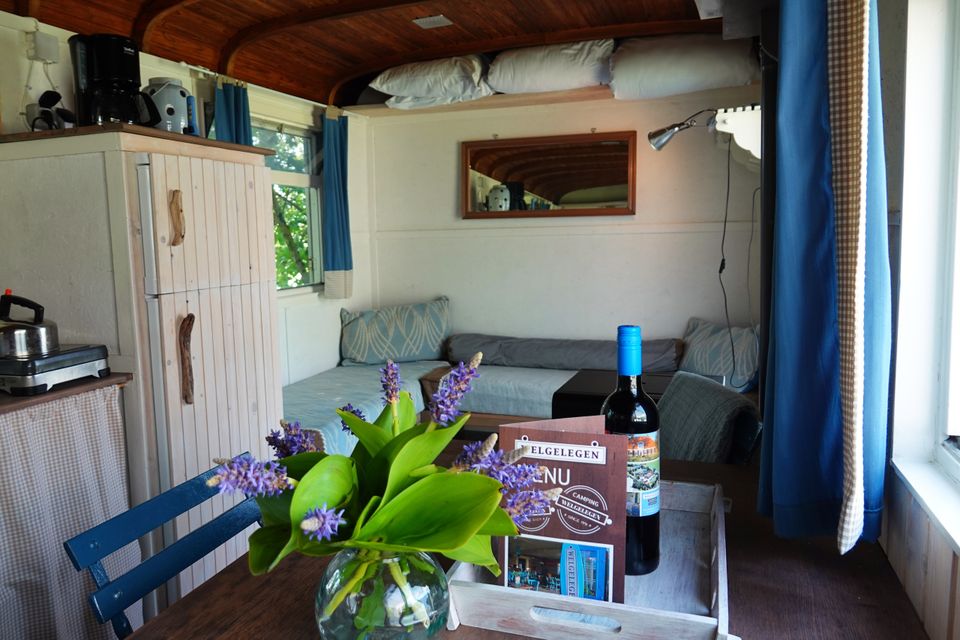 Do you want to camp in a special way? Then this four-person gypsy wagon is really something for you. In the car you will find a double bed and two sofa beds, including bed linen. If it gets a bit colder, you can turn on the heating. There is a small kitchenette with a refrigerator, coffee maker and cooking utensils. You can barbecue on the veranda and enjoy the sun while sitting on the existing furniture. A bottle of wine will be ready for you on arrival and the bread service will come by every morning to deliver fresh bread! Isn't this real glamping?
