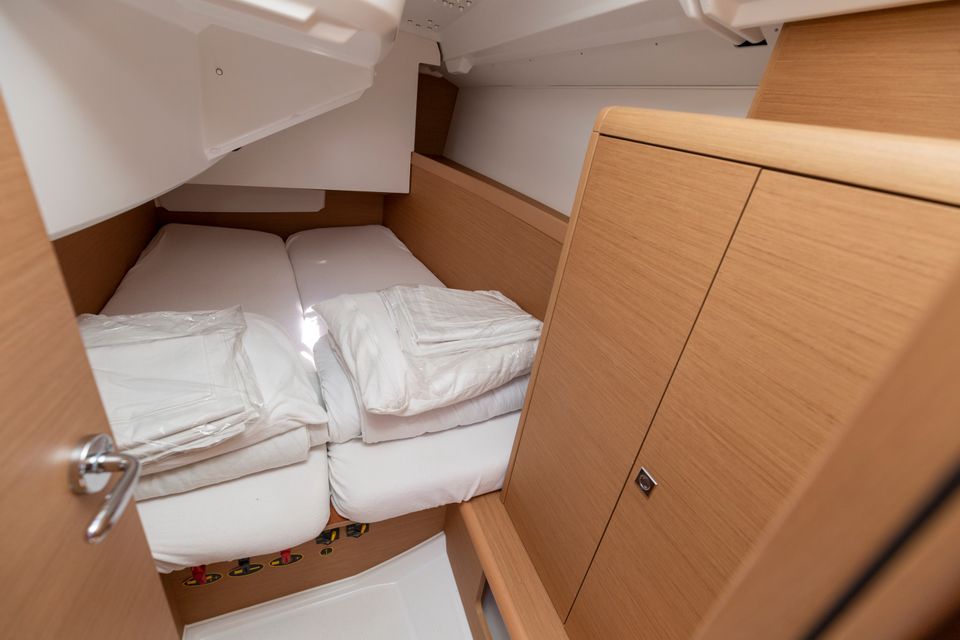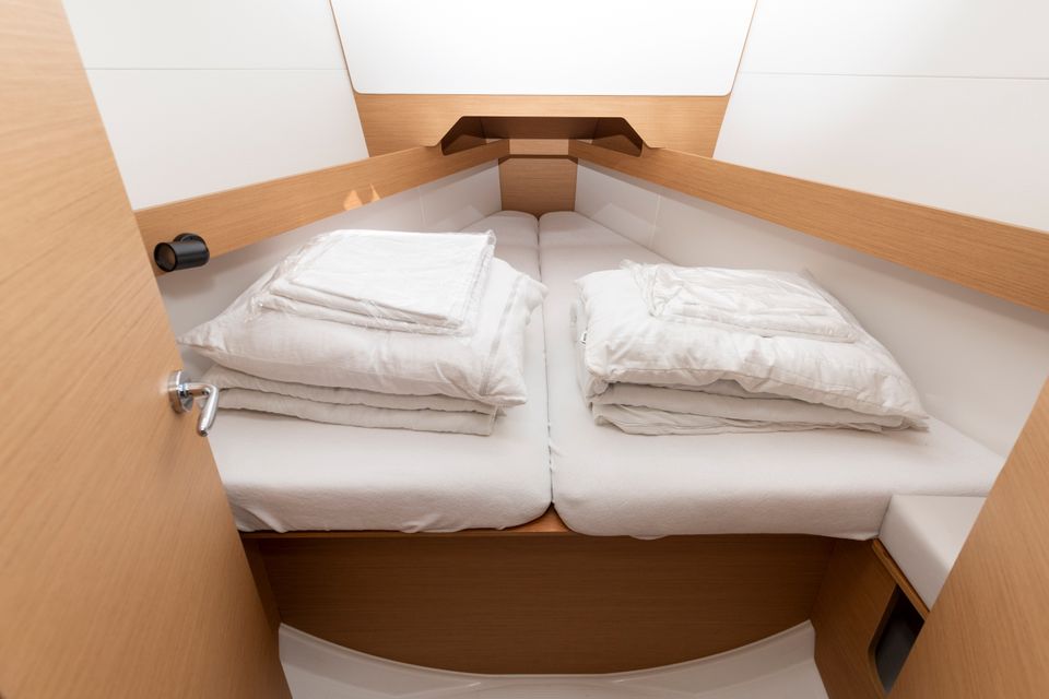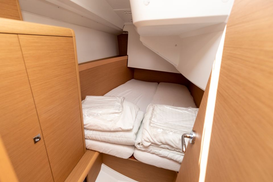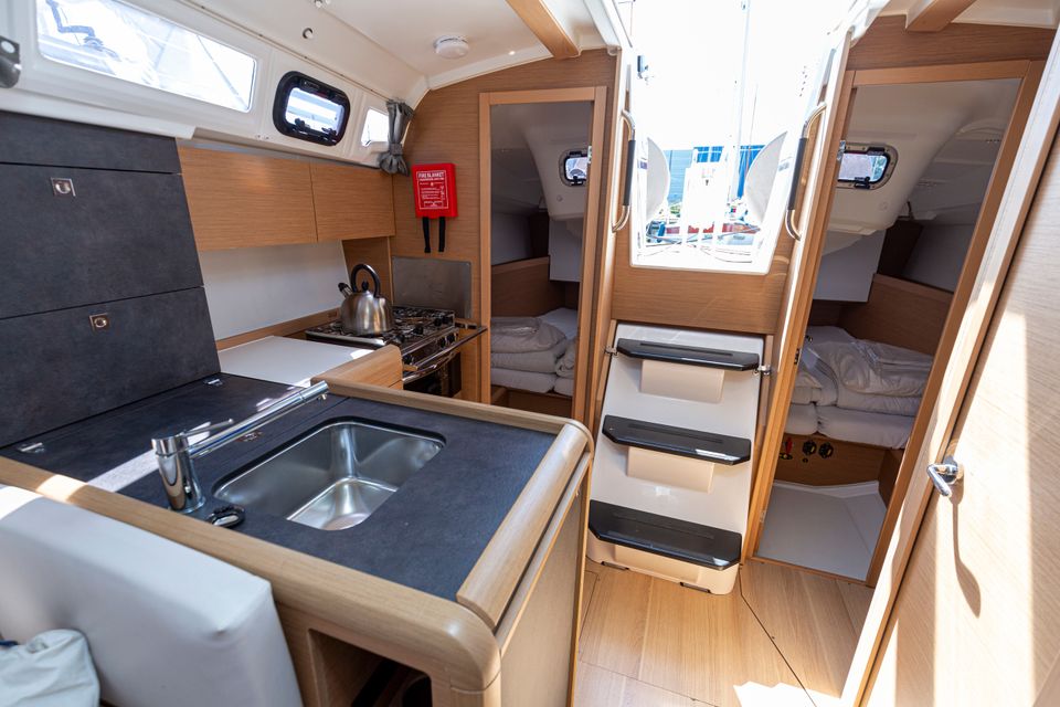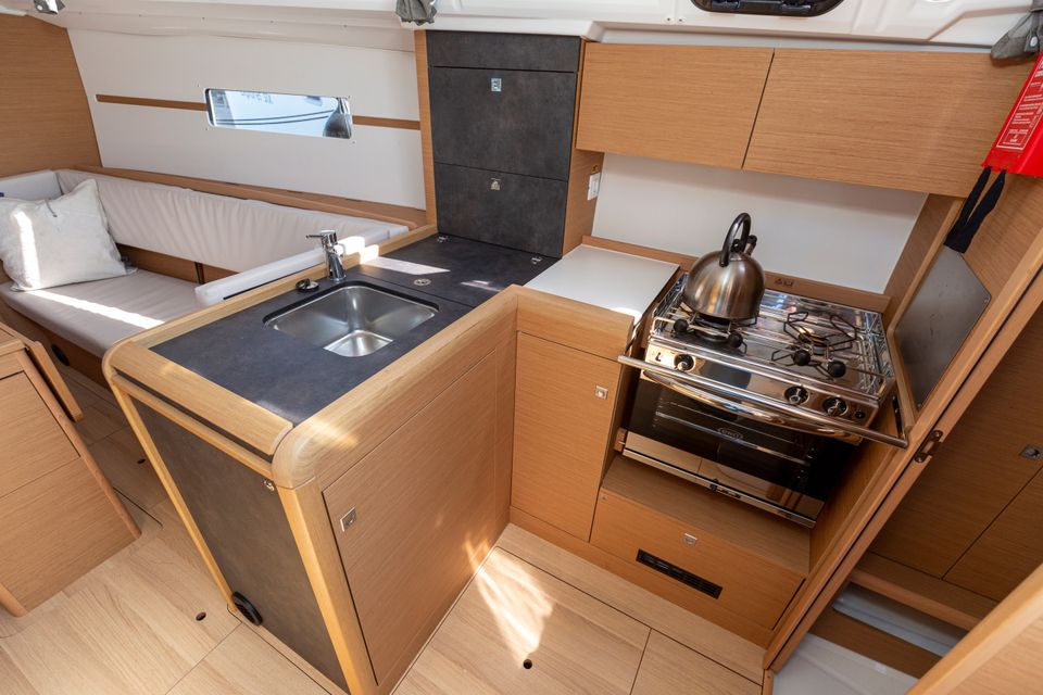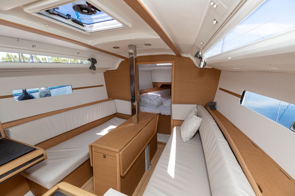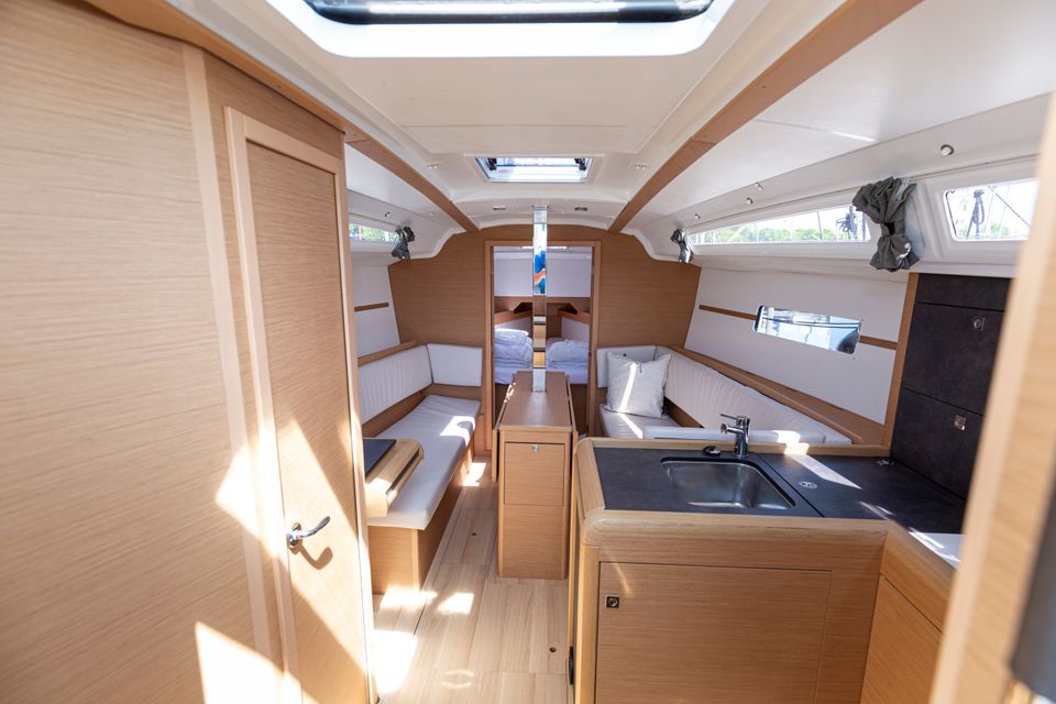 The Sun Odyssey 349 immediately captivates with its sleek lines, generous interior and welcoming cockpit, which provide an ideal combination of excellent sailing performance, comfort and safety. This seaworthy yacht guarantees stability and ease, while the maindrop system and the easy-to-handle roller furling jib add a sporty touch to the sailing pleasure.