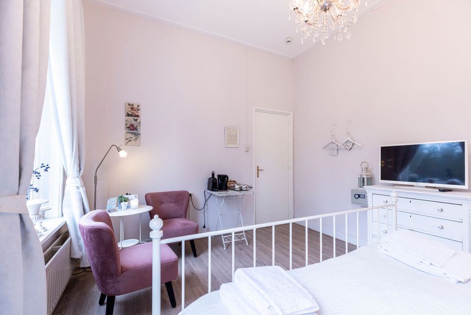 This romantic room is located at the rear of the B&B and offers a beautiful view over the Rijsterbos. The room is located on the first floor and can be reached via a spacious staircase. The room is comfortable and has a cozy double bed (180x210). In addition, you have a sitting area with two comfortable chairs and a TV. You can easily store your belongings in the cupboard. The seat has a Senseo coffee machine and a kettle, so you can make yourself a cup of coffee or tea! You have a private bathroom with shower, toilet and sink.