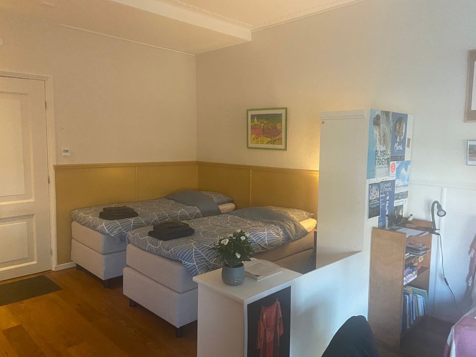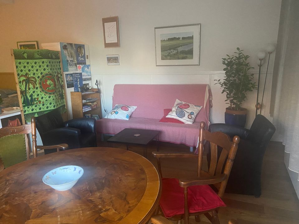 The spacious double room has its own entrance for maximum privacy. With two comfortable single box-spring beds and a handy sofa bed, it is a cozy place to relax. The living room offers a dining table and a kitchenette with a small refrigerator, kettle and coffee maker.
