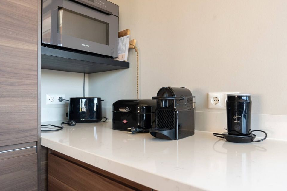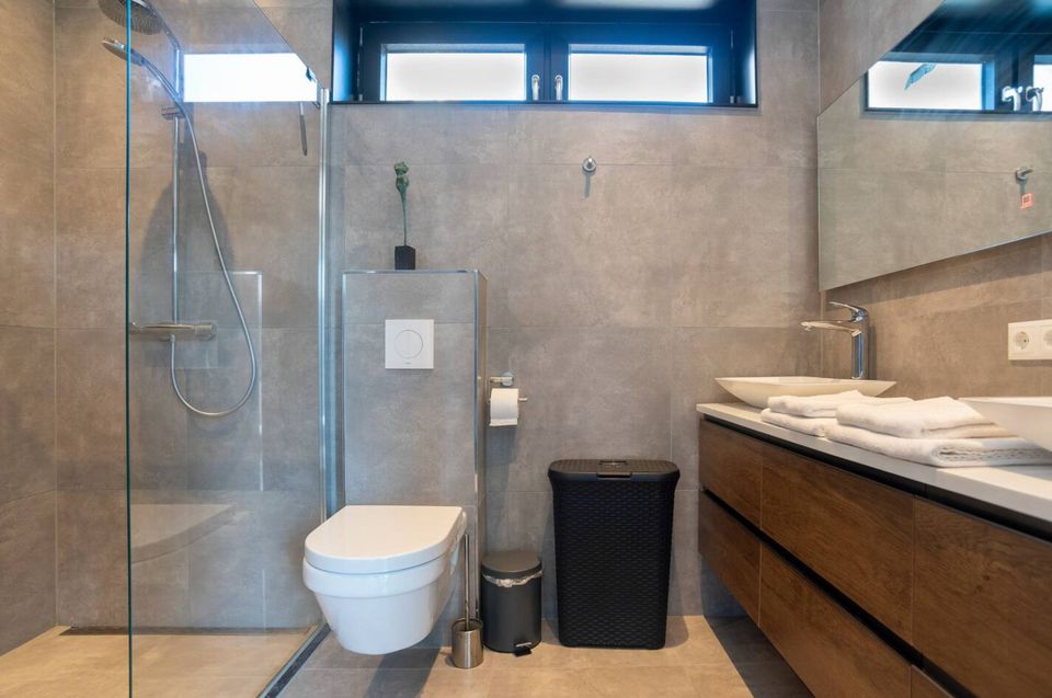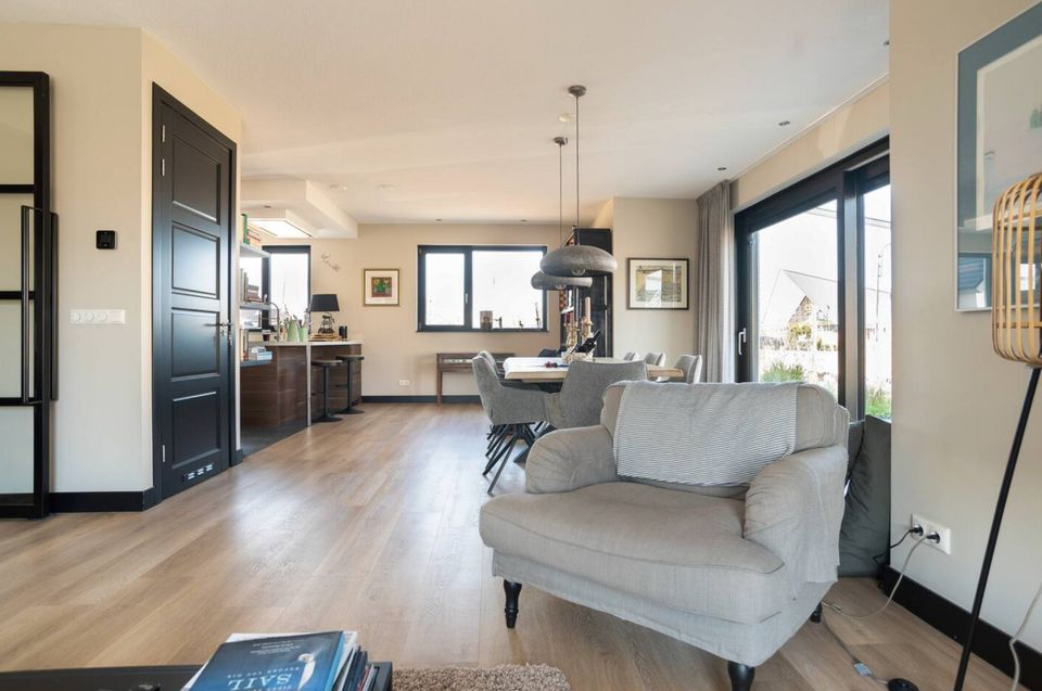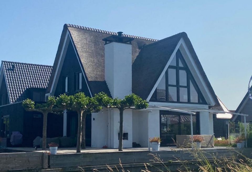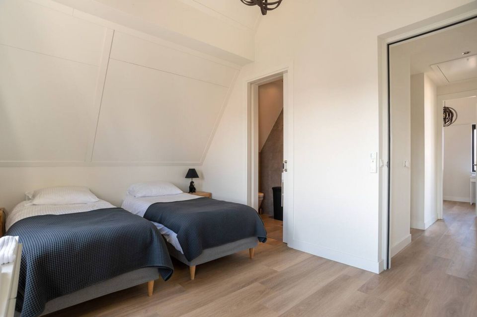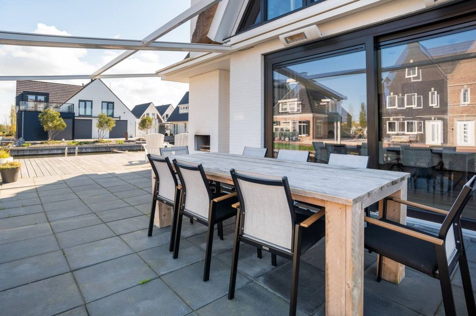 A very spacious, luxurious villa, built in 2020. Four spacious bedrooms, each with a private bathroom (shower, sink, and toilet). Three bedrooms have king-size beds and one bedroom has two single beds. The living room features a fireplace, dining table, and an open-plan kitchen equipped with all modern appliances. Sliding doors open onto the large terrace with water on two sides and several seating areas. There's also an outdoor kitchen, outdoor fireplace, and private mooring.