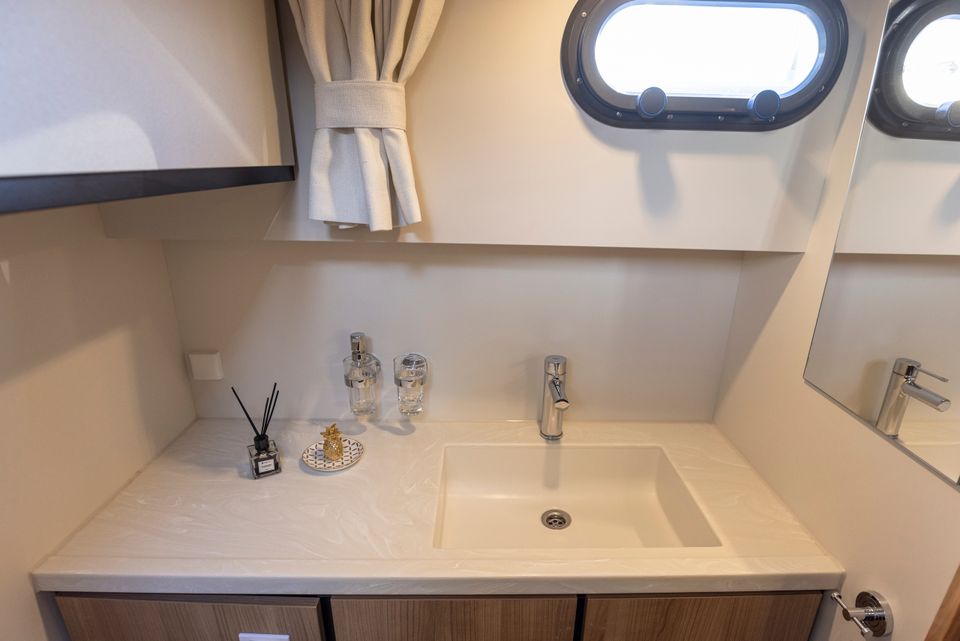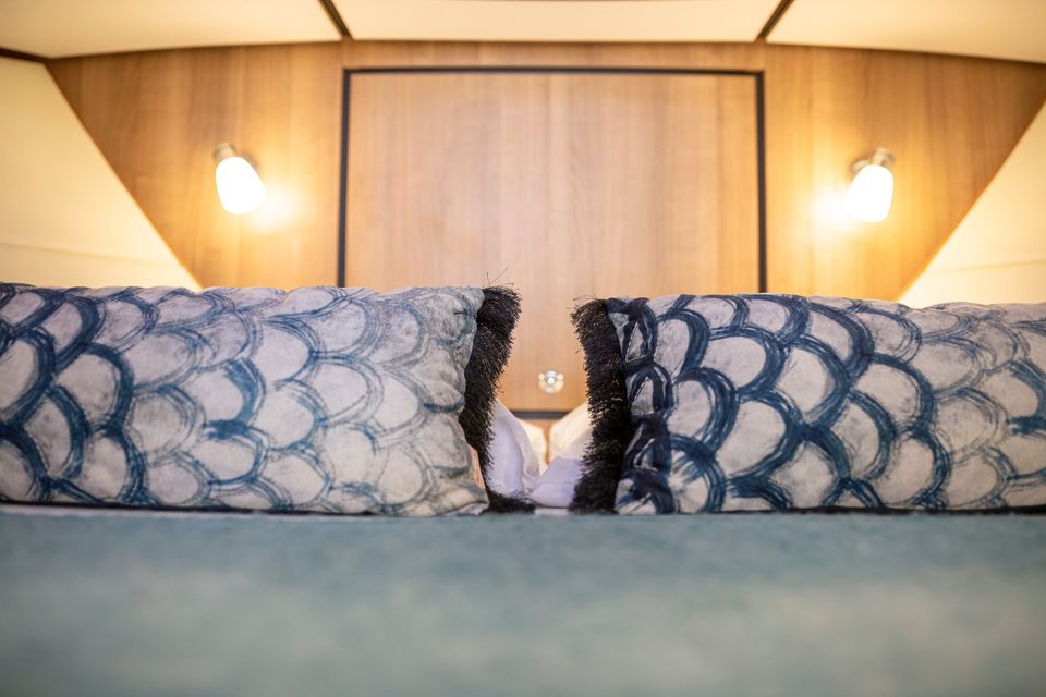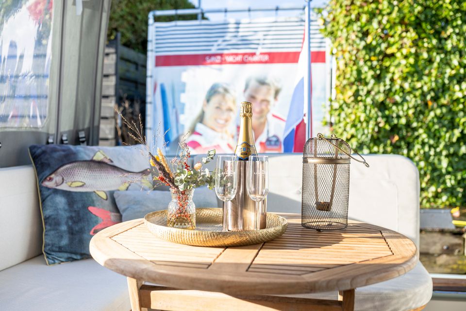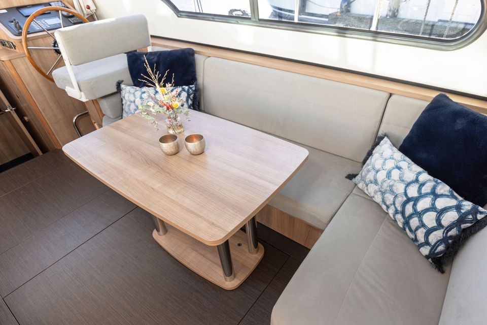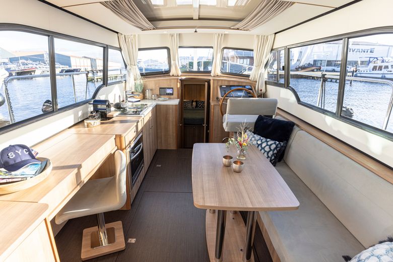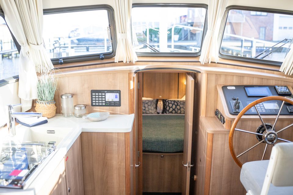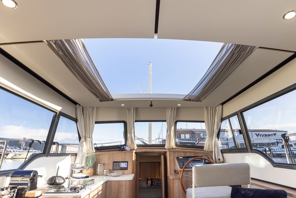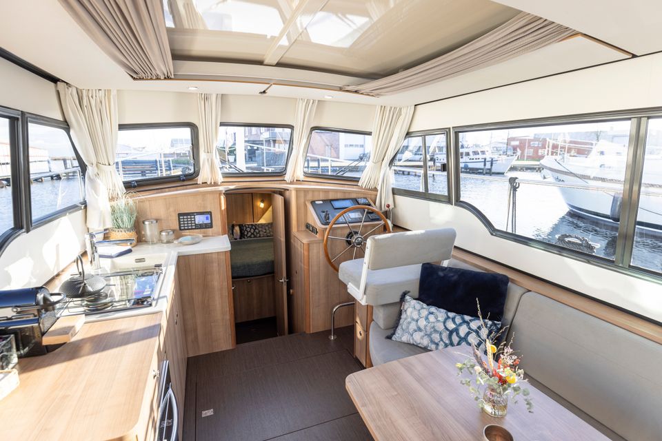 Linssen 35 SL Sedan - Silvana A chic and spacious open cockpit model from Linssen Yachts for 2 persons from the latest Sport Luxury series. A very charming open cockpit model, ideal for the Frisian waters! There is a surprising amount of space on this compact yacht! In the fore cabin is an attractive captain's cabin with a double bed, bathroom with electric toilet and washbasin and a separate wet room with a shower. On the starboard side is the steering position and dashboard which is equipped with a complete navigation package. Above the kitchen and the steering position is a ship-wide sliding hatch, which emphasizes the 'outside steering feeling'. The kitchen is on the port side and fully equipped with, among other things, a cooker, Nespresso machine and a complete kitchen inventory. Then there is the saloon in the rear part with a spacious sofa and a movable dining table. Opposite that is a lot of cupboard space and the TV. The saloon is equipped with large patio doors which give access to the open cockpit, where there is a spacious sofa. This cockpit is lockable and heated, for many pleasant hours on board.
