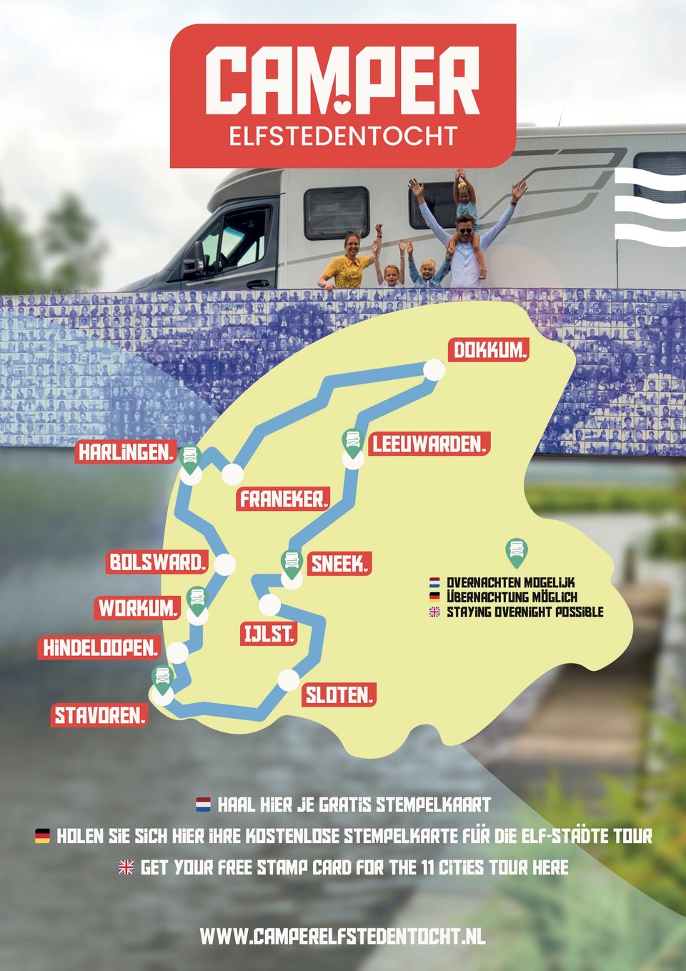 The Camperelfstedentocht is an initiative of Camperplaats Leeuwarden, in collaboration with Camping De Domp in Sneek, Camping Sudersé in Workum, Camping de Zeehoeve in Harlingen and Camperplaats Stavoren. In addition, fifty entrepreneurs join in to give tourists a unique experience of the Eleven Cities.