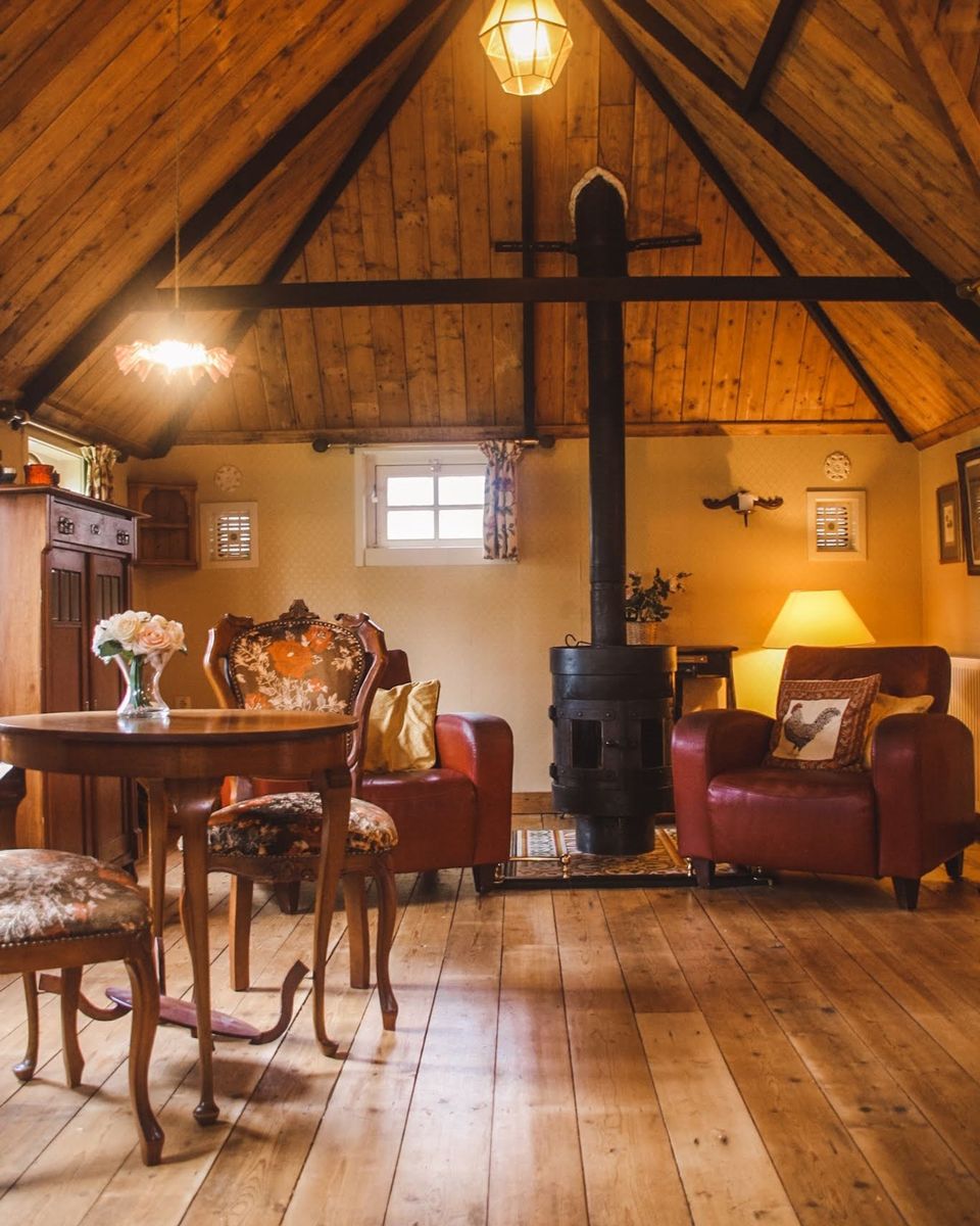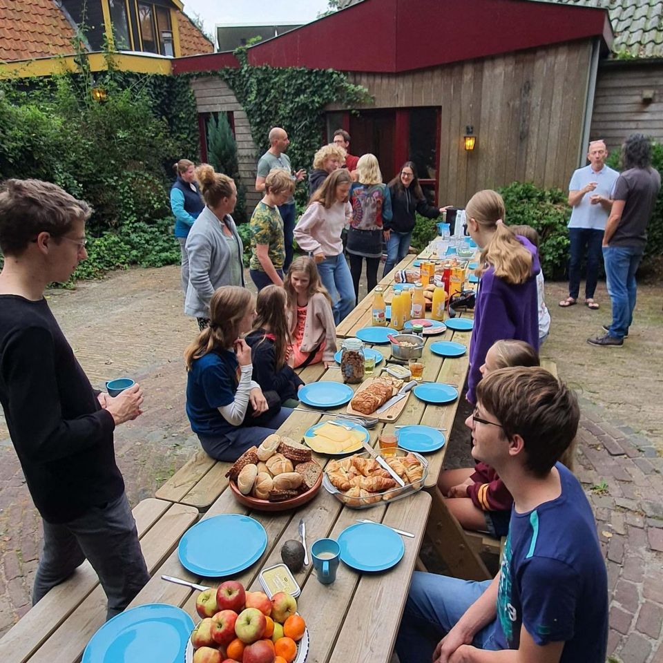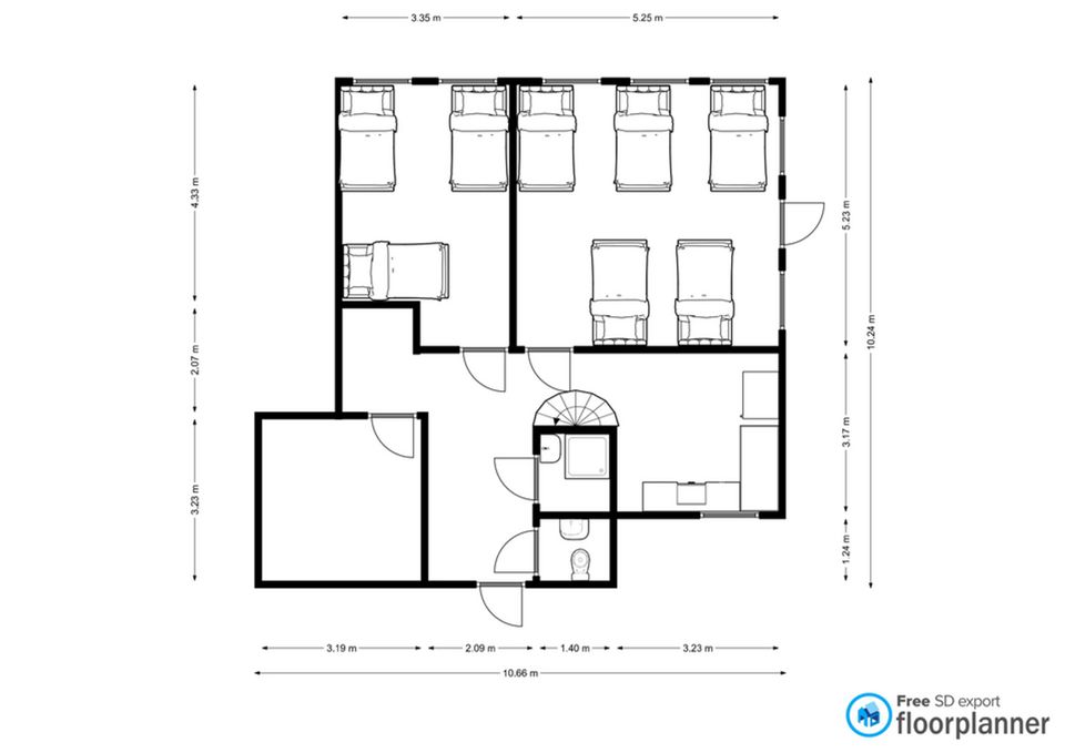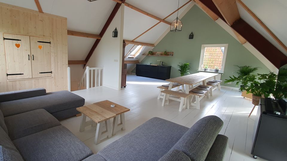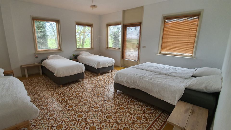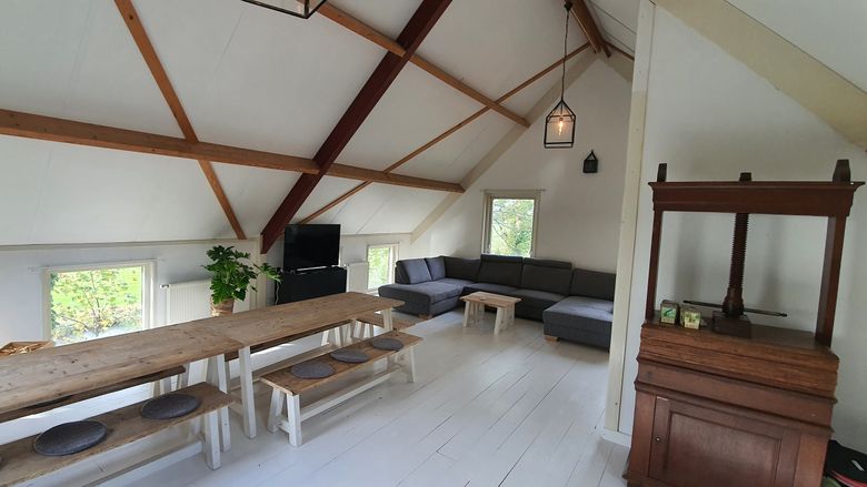 De groepsaccommodatie heeft een unieke indeling; je slaapt en kookt beneden, je woont boven! Wanneer je de woning binnenstapt zie je aan je rechterhand al de deuren naar de douche en het toilet. Even verder vind je de beide slaapkamers, de ene slaapkamer is geschikt voor drie personen en de andere slaapkamer is geschikt voor vijf personen. Op de begane grond is er ook nog de ruime, goed uitgeruste keuken, met onder andere een vaatwasser en oven. Wanneer je de trap naar boven oploopt, kom je uit in een grote woonruimte. Hier staat een gezellige en knusse bank en even verderop is de eetkamer met grote tafel. Op deze verdieping is ook een bedstee gecreëerd, die geschikt is voor twee personen. Als laatste is er boven nog een kleine kitchenette waar je gemakkelijk een kopje koffie of thee zet. Rondom het huis is een ruime tuin met onder andere een plaats waar je een kampvuur kunt maken.