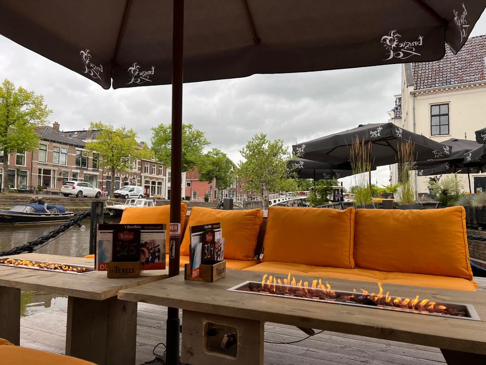 Binnen fielt it waarm oan, mei in Ingelske útstrieling. Bûten sitst rom op it terras, midden yn de stêd. It wetter en de strjitsjes fan Dokkum foarmje it dekôr.