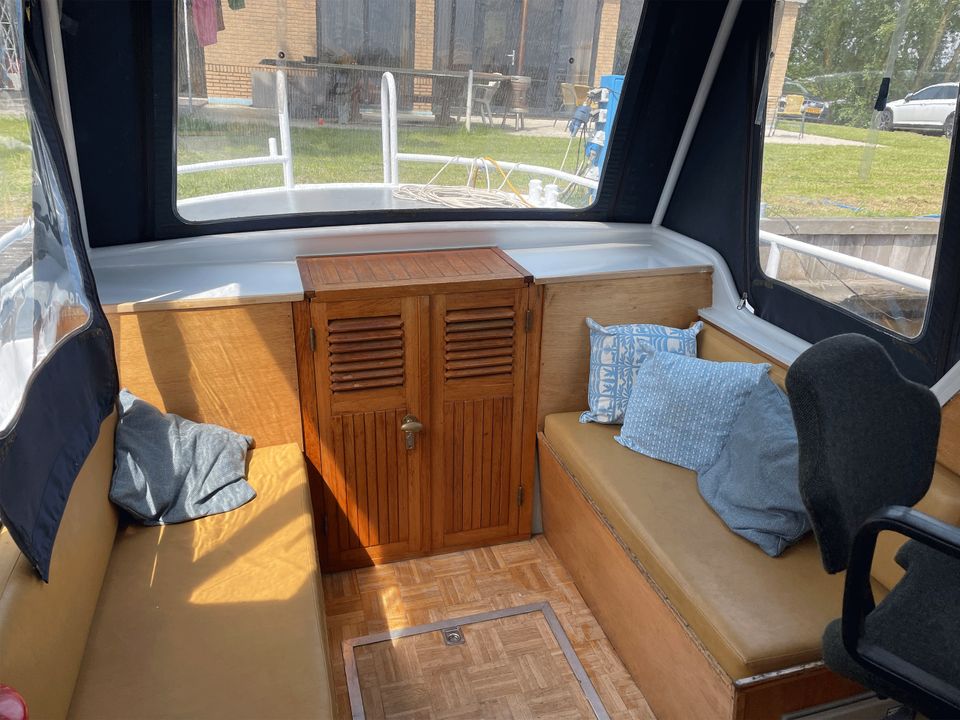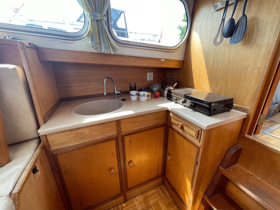 De Ouwe Peer is een compacte maar functionele boot, ideaal voor een vaarvakantie. De buitenkant is volledig geschilderd voor een frisse uitstraling, terwijl het interieur eenvoudig maar schoon en netjes is. De boot beschikt over gescheiden slaap- en leefruimtes, met 3 eenpersoonsbedden in de achterkuip. Het keukentje heeft een 2-pits gasstel en een volledige inventaris. Een grote koelbox, aangesloten op de accu, houdt eten en drinken gekoeld. Daarnaast is er een toilet aan boord. De tent op het achterdek kan worden geopend, zodat je bij goed weer volop van de zon kunt genieten.