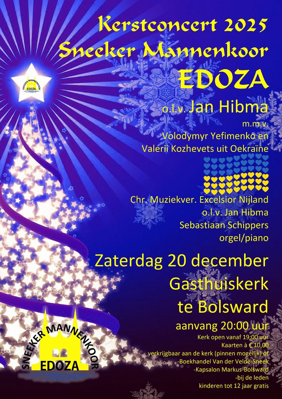 Zaterdag 20 december 2025 geeft het Sneeker Mannenkoor EDOZA weer haar jaarlijks Groot Kerstconcert. Deze keer in de Gasthuiskerk, Gasthuissingel 33, 8701 BL, Bolsward.