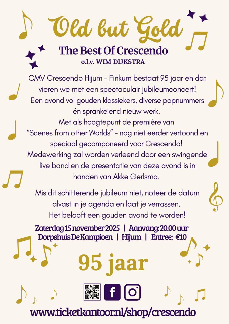 Op zaterdagavond 15 november is er goud dat klinkt in Dorpshuis de Kampioen te Hijum. Fanfare Crescendo, onder leiding van Wim Dijkstra, viert namelijk haar 95-jarig bestaan met een verrassend concert; ‘OLD BUT GOLD, The Best of Crescendo’.