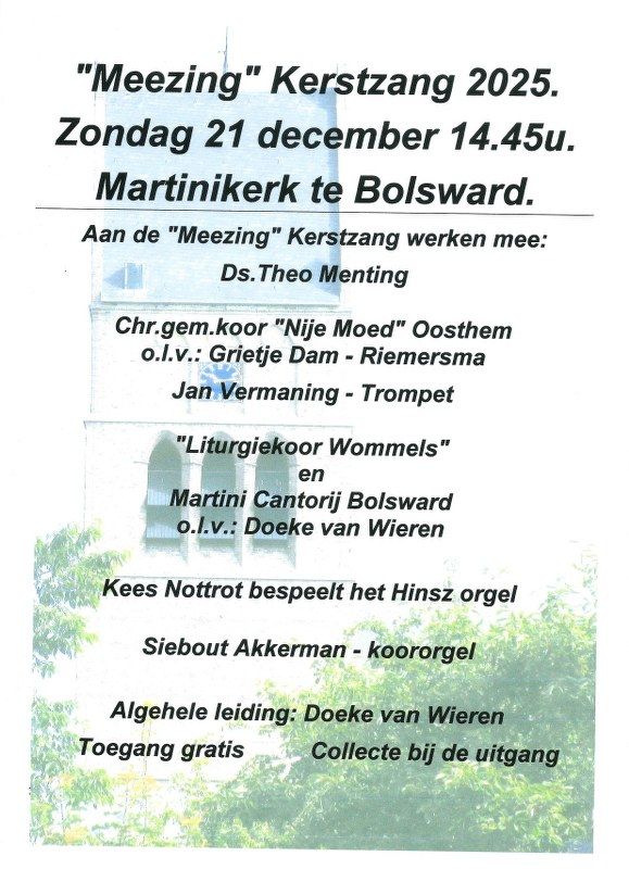 Wil je nog meezingen met kerstliederen op zondagmiddag 21 dec. 2025.....? Wel, dat kan op zondagmiddag 21 dec. 2025 van 14.45u tot 16.00u in de Martinikerk te Bolsward.