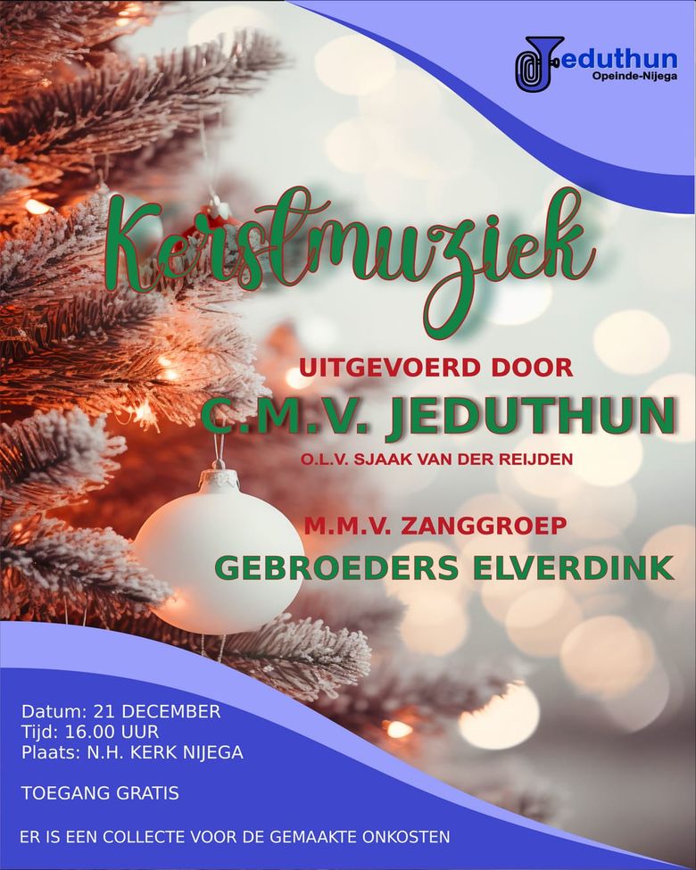 Feestelijke kerstmuziek bij Jeduthun. Op zondagmiddag 21 december a.s. organiseert muziekvereniging Jeduthun uit Opeinde-Nijega een concert met feestelijke kerstmuziek.