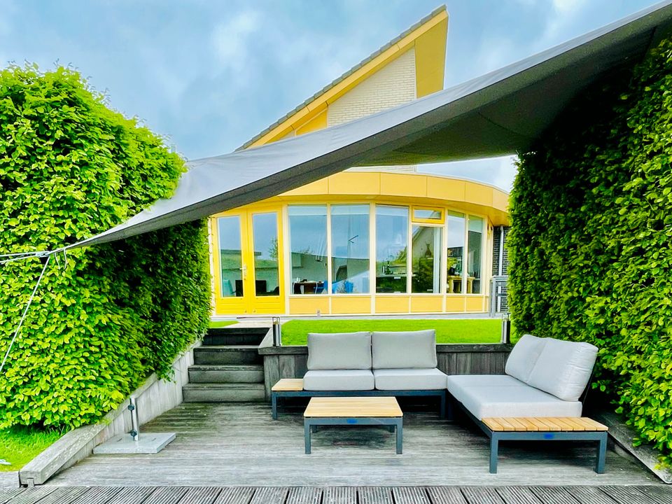 Door de halve cirkelvormige woonkamer met veel ramen heb je een mooi uitzicht op de tuin en het water. Vanuit de woonkamer stap je via de openslaande tuindeuren zo lekker de zonnige tuin in.