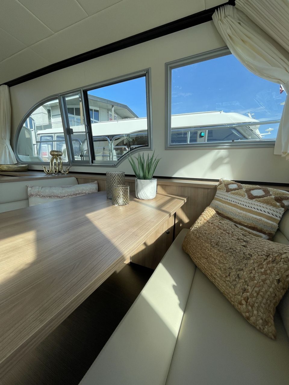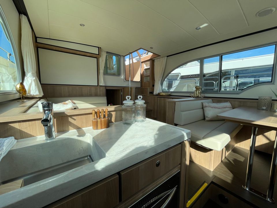 Dit luxe schip is uitgevoerd met prachtige details zoals een achterdek met teakhout! De boot beschikt over drie slaapcabines. Twee slaapcabines beschikken over een tweepersoons bed met eigen badkamer en toilet. De derde slaapcabine heeft twee eenpersoonsbedden en voldoende kastruimte. Het interieur van deze boot is licht en er is gebruik gemaakt van een lichte houtsoort. Tegenover de keuken is een comfortabele eethoek met veel lichtinval. De keuken is ruim opgezet en beschikt onder andere over een Nespresso apparaat. Tevens is er een comfortabele zithoek met televisie en Apple TV. Het achterdek heeft een ruime vaste bank met kussens en is voorzien van een cabriotent. Op zonnige dagen kun je deze openen en als het regent kun je de tent eenvoudig afsluiten. Tevens is het mogelijk om het achterdek te verwarmen! Dit jacht is compleet uitgerust met een navigatiepakket, boeg- en hekschroef.