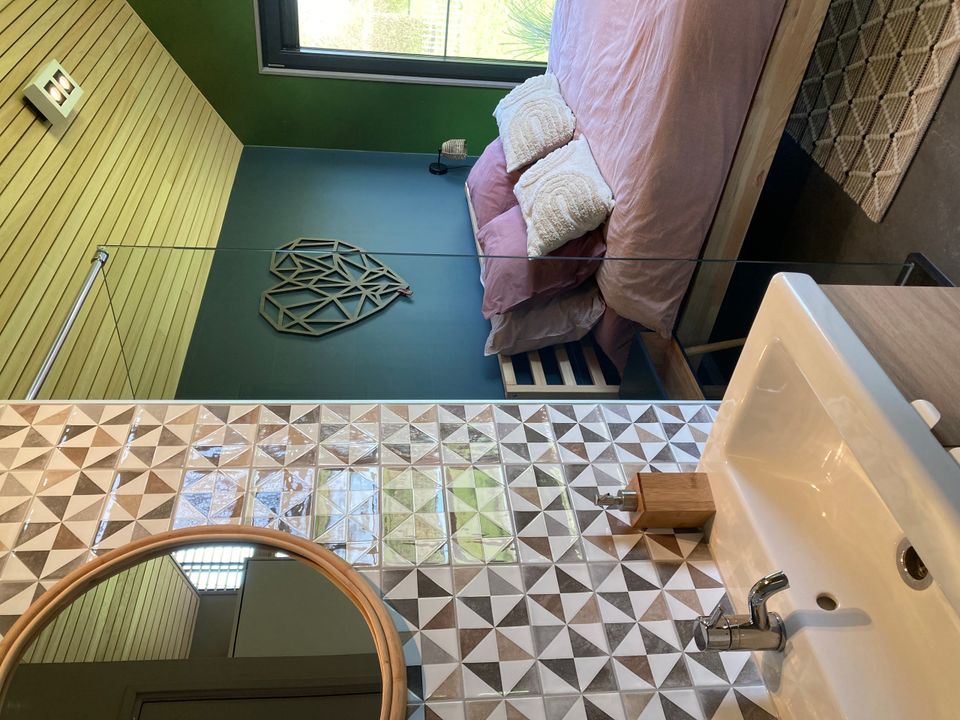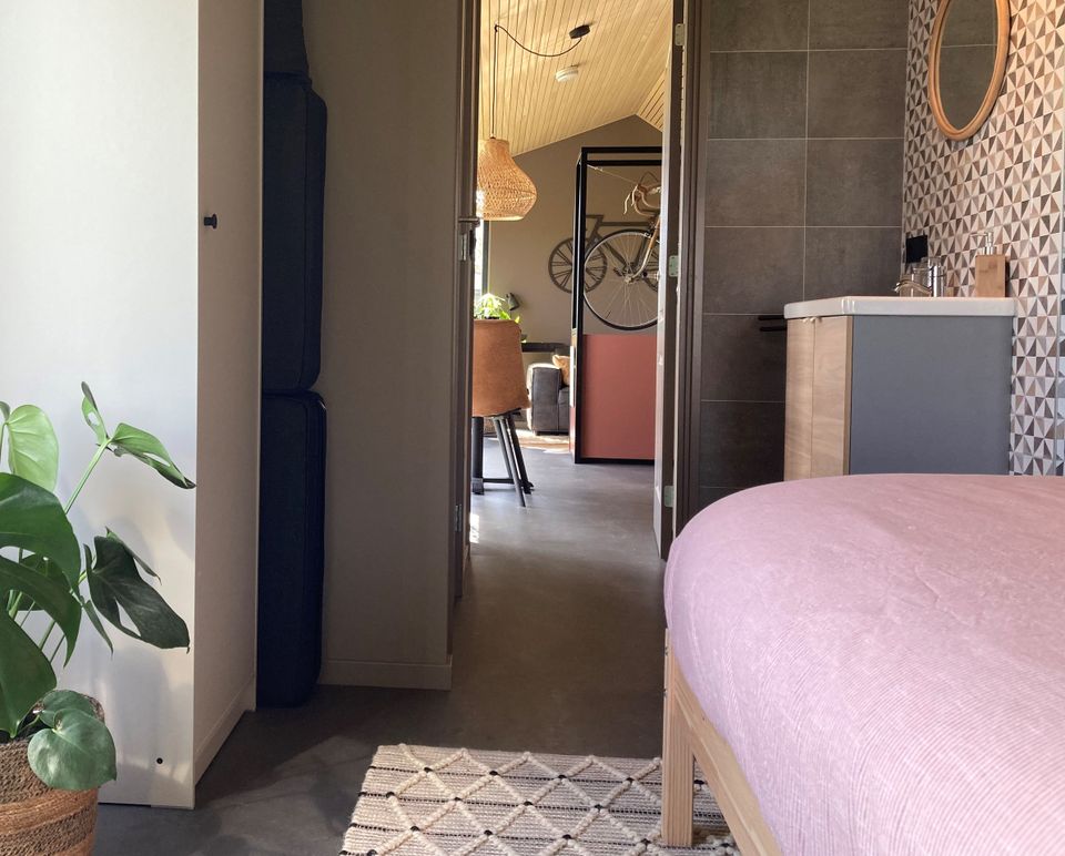 Tiny House Oblique is ideaal voor twee personen. Het beschikt over een tweepersoonsbed, een badkamer met douche en een volledig uitgeruste keuken, inclusief vaatwasser. De openslaande tuindeuren geven toegang tot een privé tuin met loungebank, een verhoogd terras en een vuurplaats met BBQ.