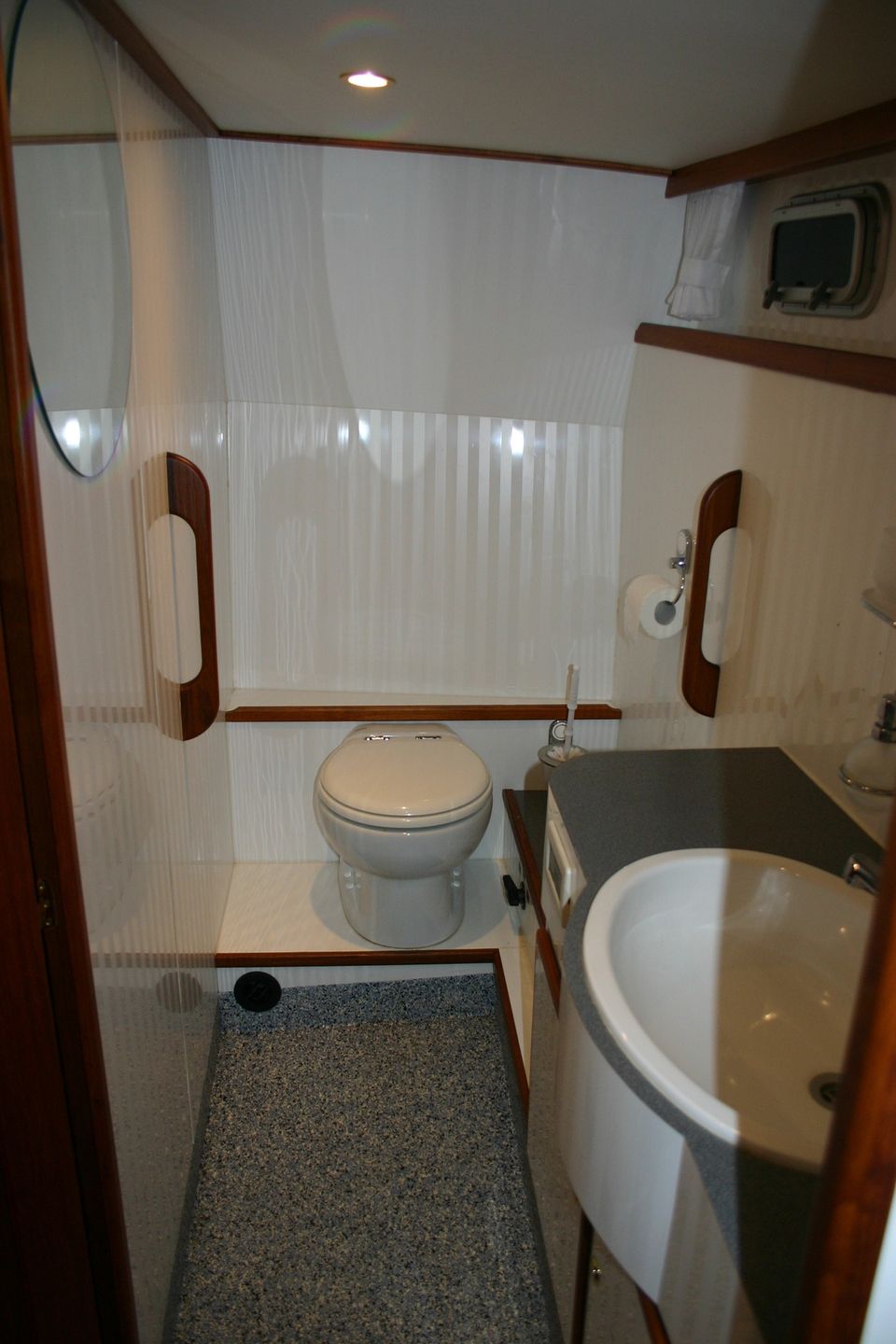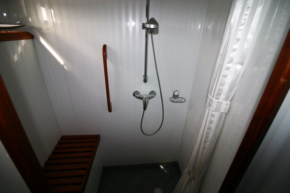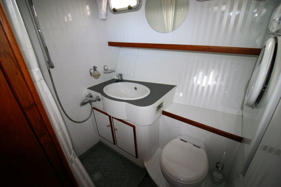 In de achterkajuit slaap je comfortabel in een groot tweepersoonsbed met lattenbodem. Ook hier is een ruime badkamer met elektrisch toilet, wastafel en een royale douche.