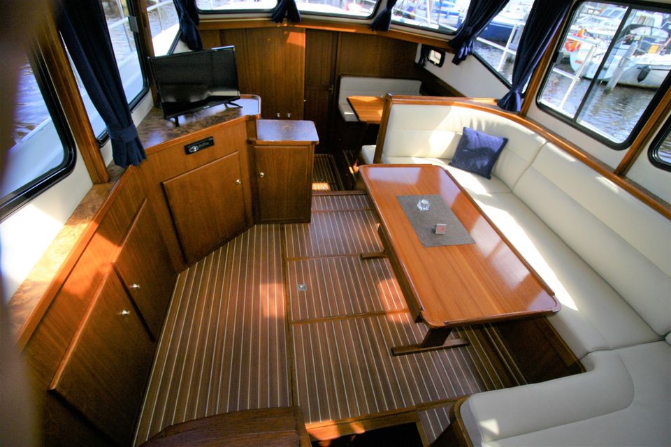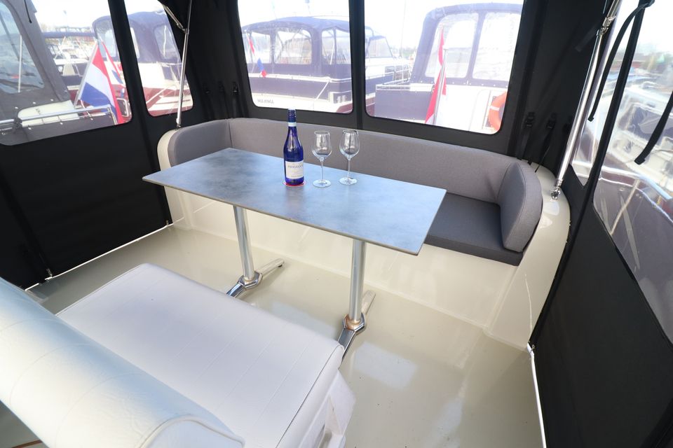 Op het grote zonnedek vind je een stuurstand, zonnepaneel, XL-cabriotent, vaste zitbank, dekstoelen, een tafel en een zwemplateau met zwemtrap.