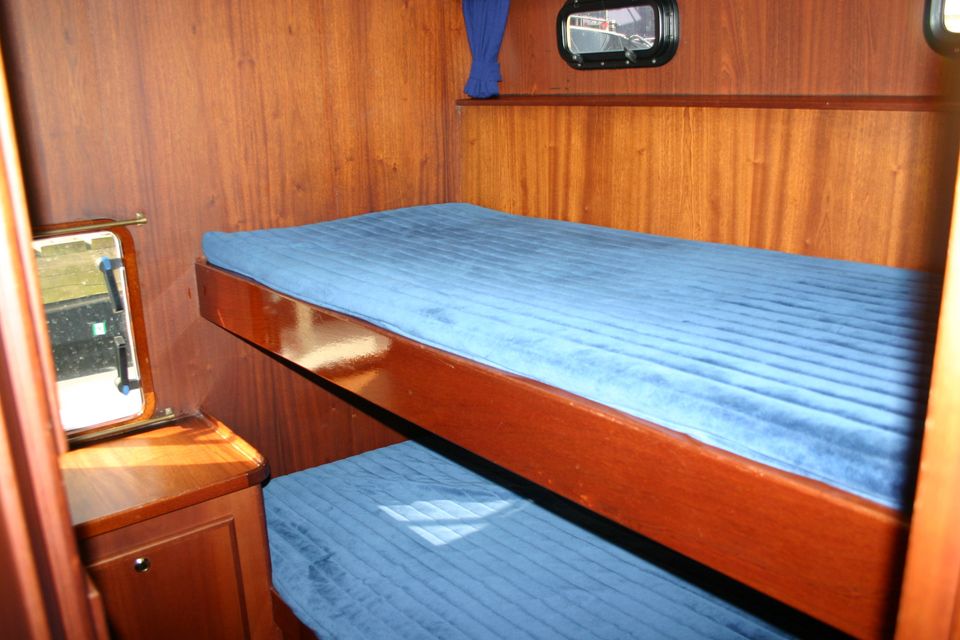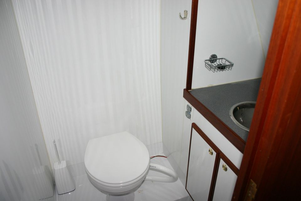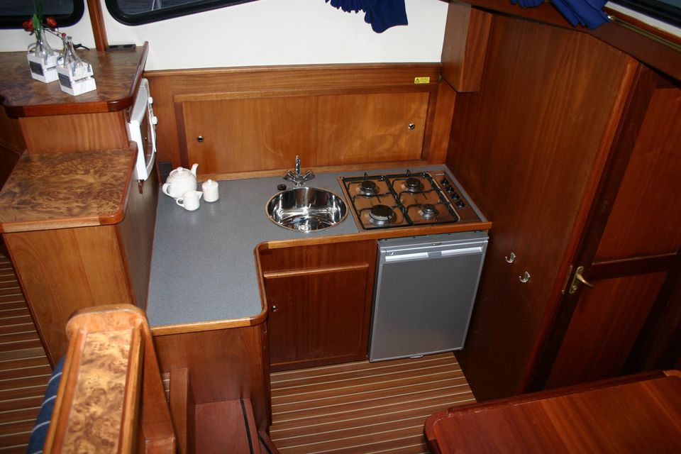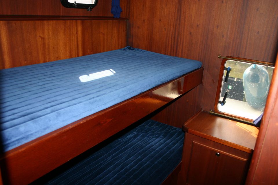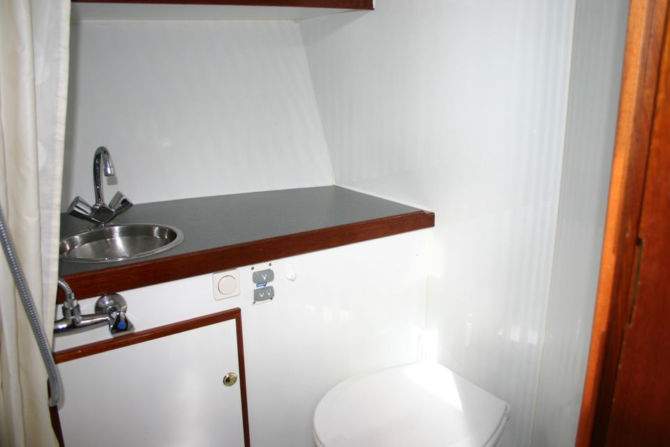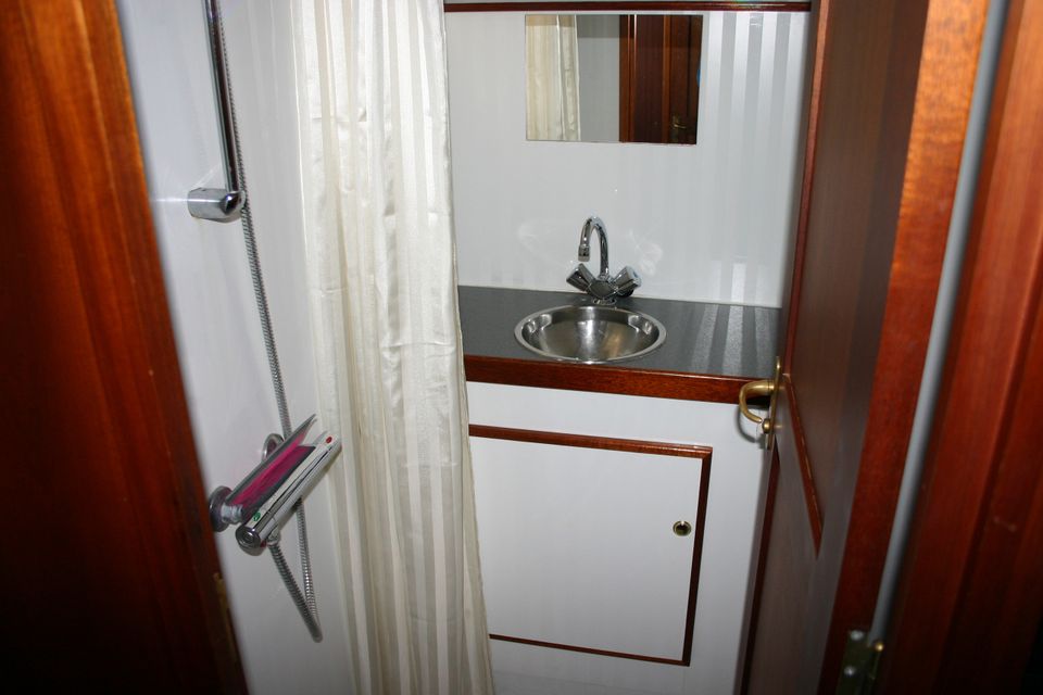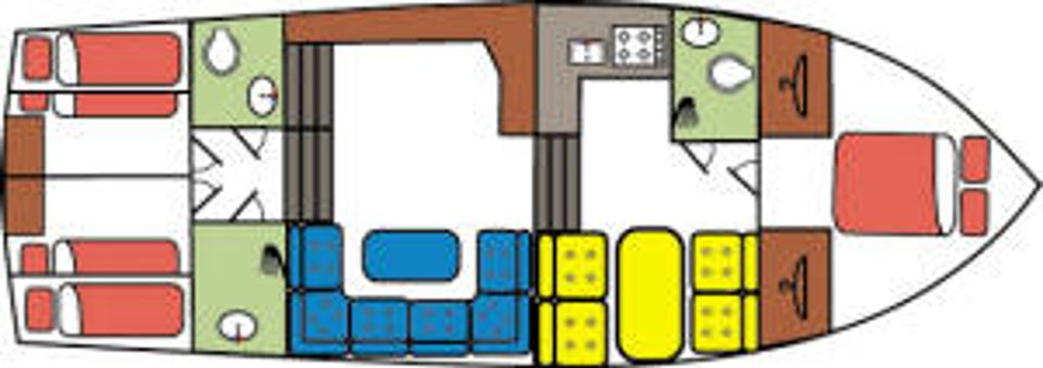 Indeling: In de voorkajuit vind je een tweepersoons Frans bed, opbergruimte, een elektrisch toilet en een aparte douche. De luxe keuken is volledig ingericht voor 8 personen en beschikt over een 4-pits kooktoestel, koelkast, magnetron, koffiezetapparaat en een complete inventaris. In de comfortabele salon geniet je van een ruime zithoek, tv en een radio-cd-speler. In de achterkajuit zijn twee aparte slaaphutten met elk een stapelbed en voldoende bergruimte. Verder is er een tweede elektrische toilet, een wastafel en een separate douche.