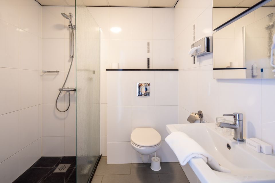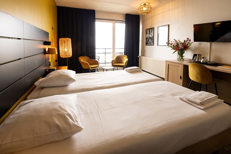 De Zuiderzeezicht kamer heeft een prachtig uitzicht over de voormalige Zuiderzee, tegenwoordig IJsselmeer. De kamers zijn zowel op de begane grond als op de eerste en tweede etage gelegen. De kamers op de begane grond beschikken over een eigen terras en de kamers op de eerste en tweede etage hebben een balkon. De kamer is voorzien van twee comfortabele eenpersoons boxspringbedden, een zitje, bureau en televisie, evenals koffie- en theefaciliteiten. De badkamer beschikt over een douche, toilet, wastafel en föhn.