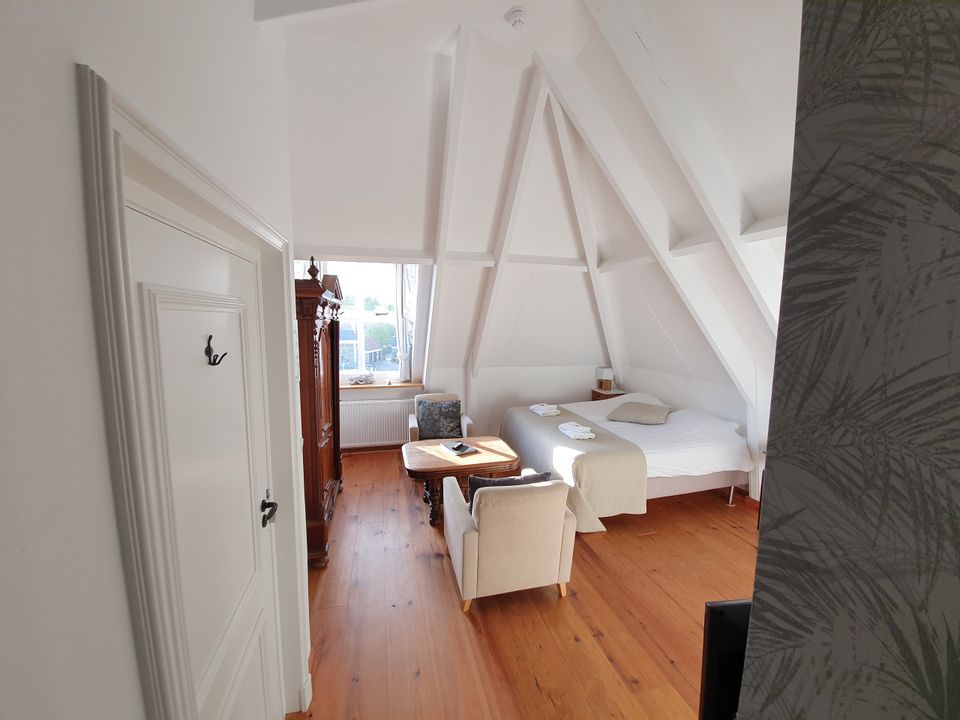 Sfeervolle comfortabele hotelkamer op de tweede etage van het hotel met zicht op het water en de welbekende Waterpoort. In de kamer bevindt zich een tweepersoons boxspringbed en een klein woongedeelte met flatscreentelevisie. De kamer heeft een eigen kleine keuken met compleet inventaris. Tevens beschikt het over een ruime badkamer met douche, wastafel en toilet.