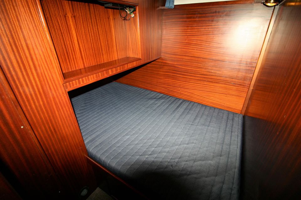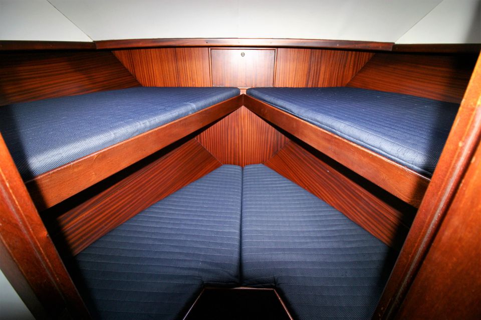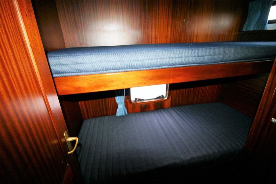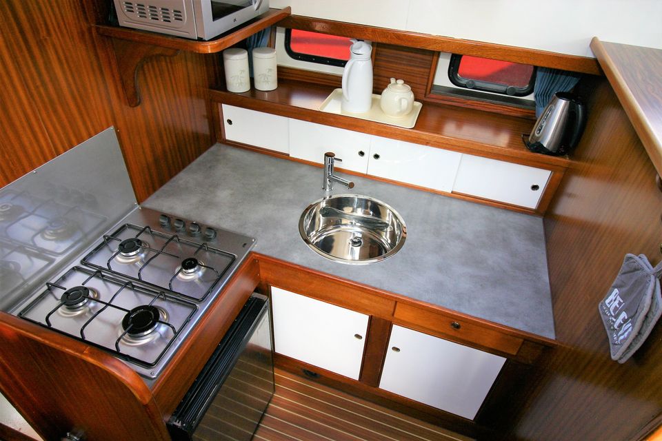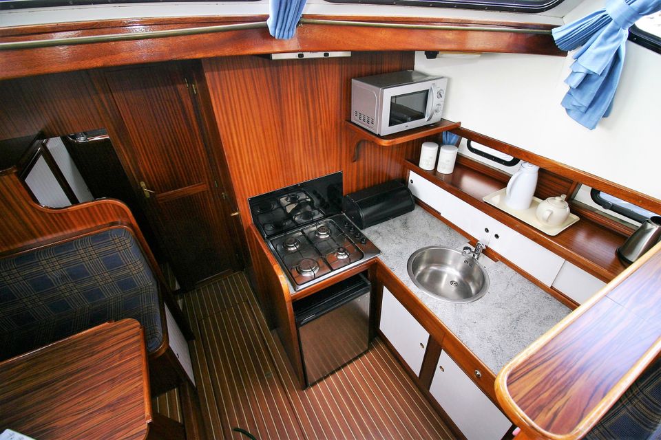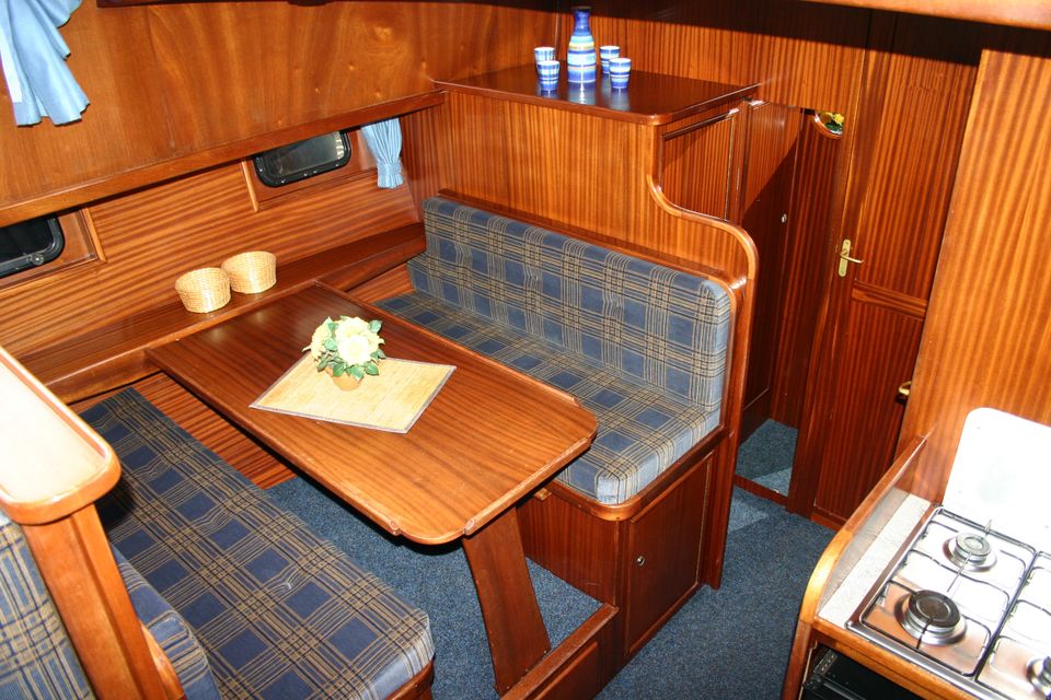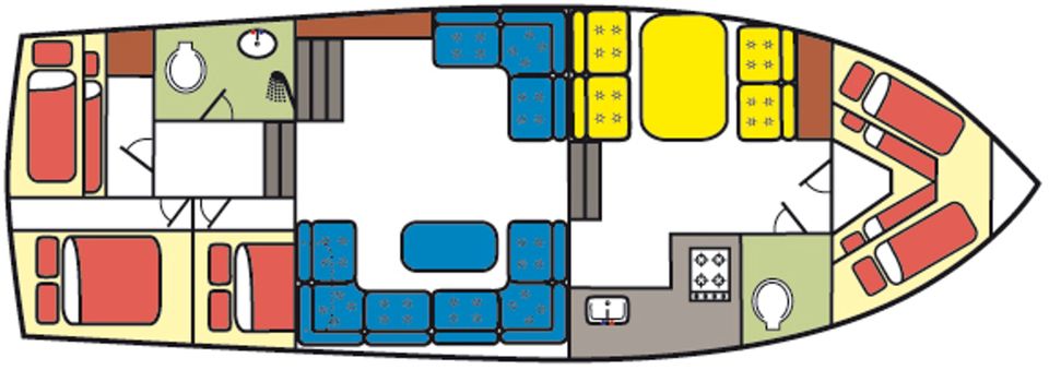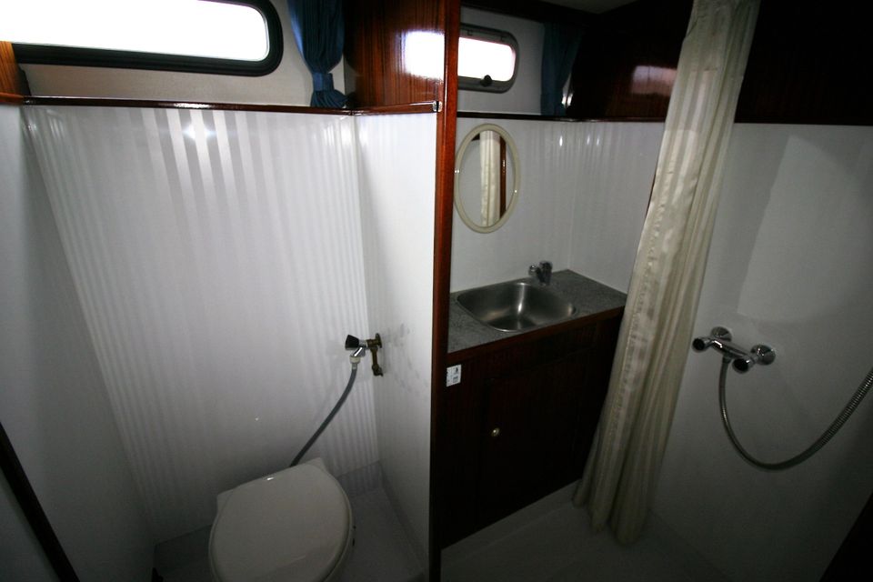 Indeling: In de voorkajuit vind je een afgesloten vierpersoonshut en een elektrisch toilet. De ruime keuken is volledig ingericht voor 12 personen en beschikt over een 4-pits kooktoestel met afzuigkap, koelkast, koffiezetapparaat, magnetron en een complete inventaris. De salon is comfortabel ingericht met een grote zithoek, tv en radio-cd-speler. In de achterkajuit bevinden zich drie afgesloten tweepersoonshutten, een douche, een tweede elektrisch toilet en een wastafel.
