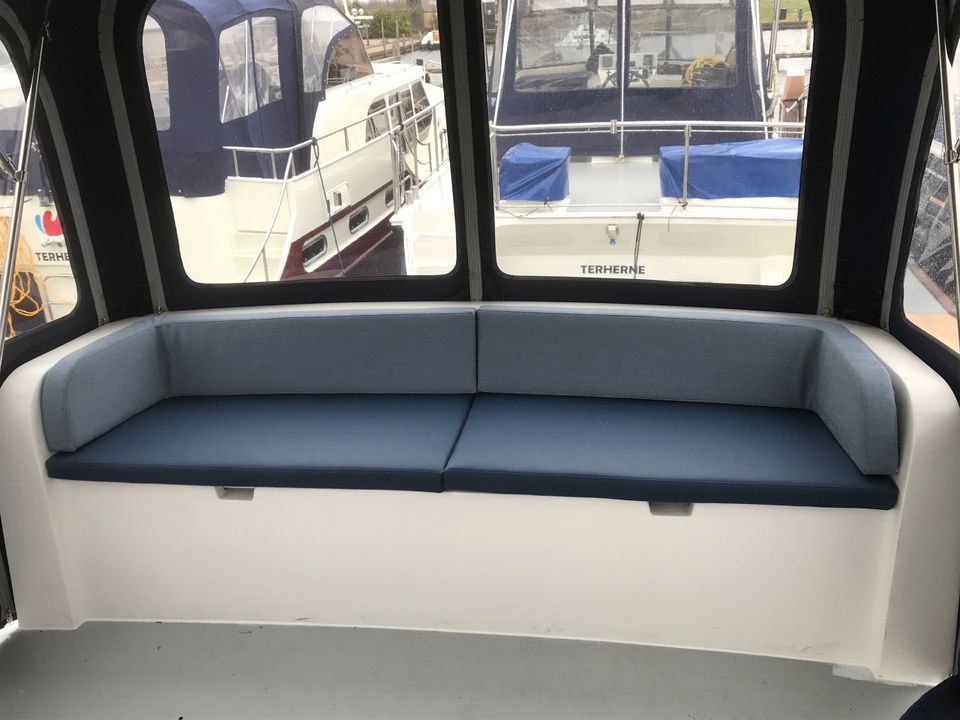 Buiten geniet je van het grote zonnedek met stuurstand, zonnepaneel, vaste bank, extra koelkast, XL-cabriotent, dekstoelen en een tafel. Via de geïntegreerde wenteltrap loop je eenvoudig naar het zwemplateau met zwemtrap – ideaal om aan of van boord te stappen of voor een frisse duik.