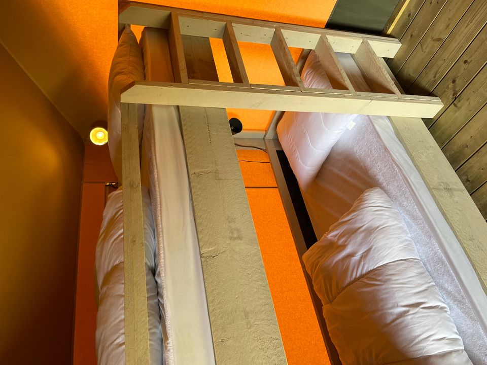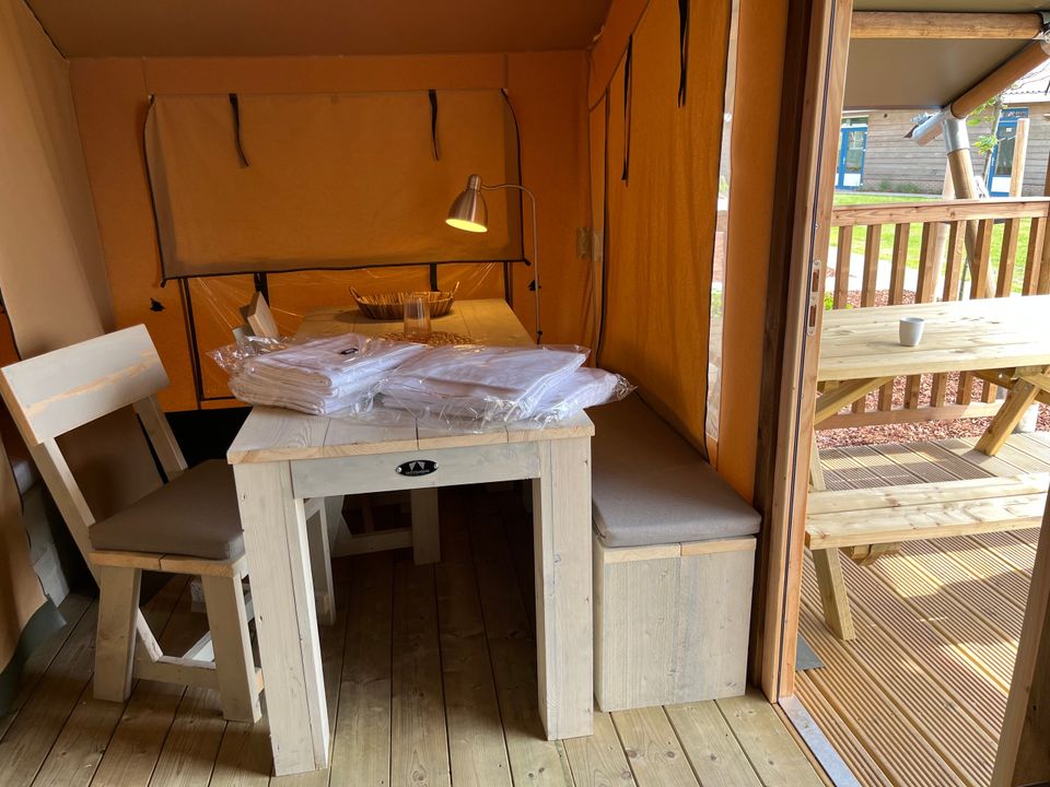 Geniet van een heerlijke vakantie in deze ruime luxe vierpersoons glampingtent. De tent beschikt over twee aparte slaapruimtes! Zo vind je er twee slaapkamers, waarvan een met een tweepersoonsbed en een met een stapelbed. In de tent is eveneens een compleet ingerichte keuken met koelkast, inductiekookplaat. De keuken is gesitueerd in een open ruimte waar ook een eettafel met plek voor vier personen is. Op het grote vlonder terras staat een picknicktafel en een heerlijk bank met zachte kussens om lekker te ontspannen en genieten van het mooie uitzicht.