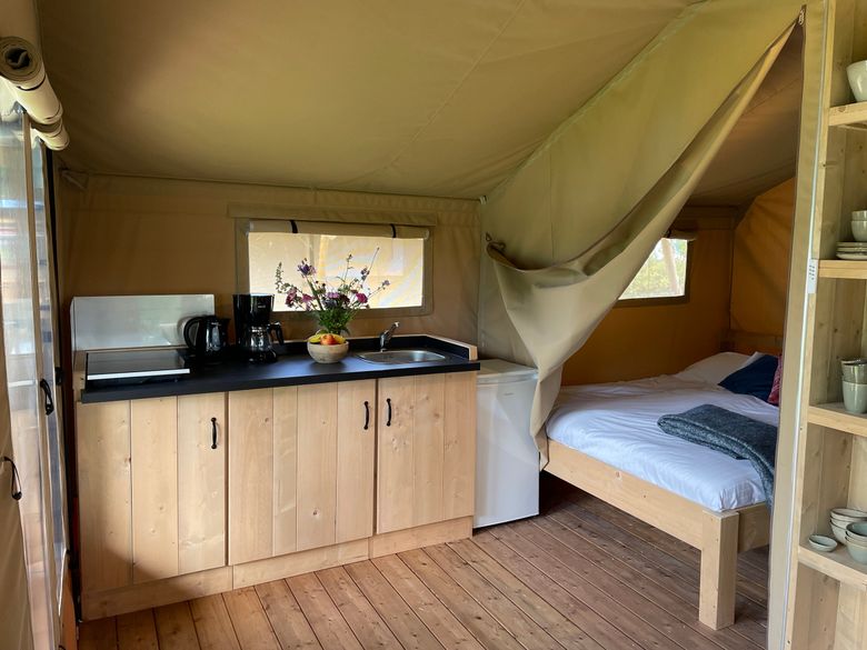 Op de camping staan twee stoere en robuuste safaritenten die ruimte bieden aan vijf personen. De tenten zijn modern en luxe ingericht. De voorkant van de safaritent kan volledig worden geopend, wat bij mooi weer zorgt voor een heerlijk open gevoel. Daarnaast beschikt elke tent over een terras met een luifel, zodat je ook bij minder goed weer comfortabel buiten kunt zitten. Binnenin vind je een ruime en gezellige voorcabine waar je heerlijk kunt ontspannen. De keuken is van alle gemakken voorzien en uitgerust met stromend water. In het keukenkastje staan pannen en servies klaar om al het lekkers dat je bereidt op de elektrische kookplaat te serveren. Verder is de keuken voorzien van een koelkast, een koffiezetapparaat en een waterkoker. De tent beschikt over twee slaapcabines. Beide cabines hebben een tweepersoonsbed (140 × 200 cm), en in één van de kamers is daarnaast een stapelbed aanwezig. Beddengoed is inbegrepen, zodat je zonder zorgen kunt genieten van een goede nachtrust. Hoewel de safaritenten geen eigen sanitair hebben, kun je gebruikmaken van het ruime, moderne sanitairgebouw op de camping, waar je gratis kunt douchen.