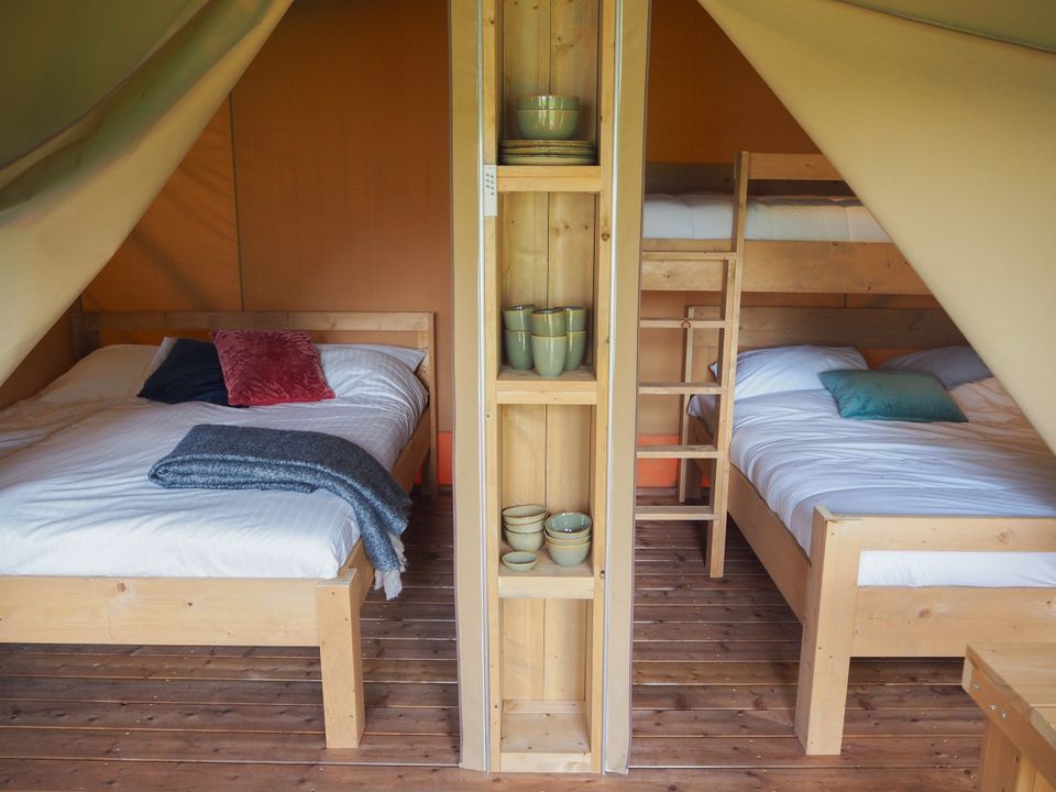 Op de camping staan twee stoere en robuuste safaritenten die ruimte bieden aan vijf personen. De tenten zijn modern en luxe ingericht. De voorkant van de safaritent kan volledig worden geopend, wat bij mooi weer zorgt voor een heerlijk open gevoel. Daarnaast beschikt elke tent over een terras met een luifel, zodat je ook bij minder goed weer comfortabel buiten kunt zitten. Binnenin vind je een ruime en gezellige voorcabine waar je heerlijk kunt ontspannen. De keuken is van alle gemakken voorzien en uitgerust met stromend water. In het keukenkastje staan pannen en servies klaar om al het lekkers dat je bereidt op de elektrische kookplaat te serveren. Verder is de keuken voorzien van een koelkast, een koffiezetapparaat en een waterkoker. De tent beschikt over twee slaapcabines. Beide cabines hebben een tweepersoonsbed (140 × 200 cm), en in één van de kamers is daarnaast een stapelbed aanwezig. Beddengoed is inbegrepen, zodat je zonder zorgen kunt genieten van een goede nachtrust. Hoewel de safaritenten geen eigen sanitair hebben, kun je gebruikmaken van het ruime, moderne sanitairgebouw op de camping, waar je gratis kunt douchen.