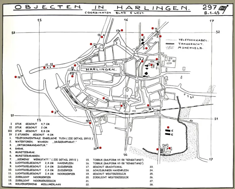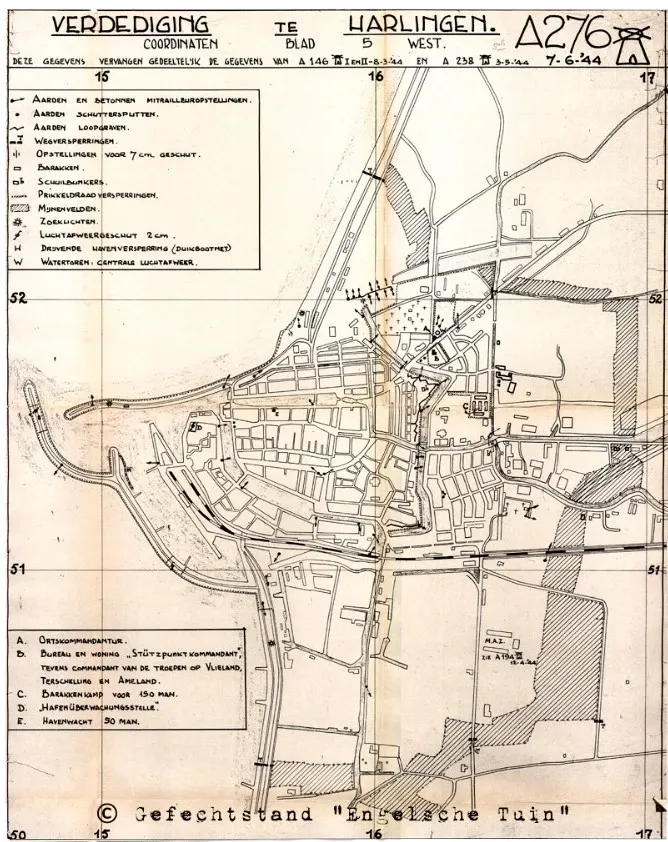 Harlingen werd niet alleen aan de zeezijde door de Duitsers verdedigd maar ook aan de oostzijde waren er verdedigingswerken. Zo waren daar mijnenvelden aangelegd, was er een tankgracht gegraven en stond er op de Midlumerweg (nu: Midlumerlaan) ook een stuk 47 mm geschut opgesteld. Bovendien waren bij het bunkercomplex in de Engelse Tuin ook betonnen bunkers en mitrailleurnesten aangelegd. Op de tekeningen hieronder zijn de alle Duitse verdedigingswerken weergeven.