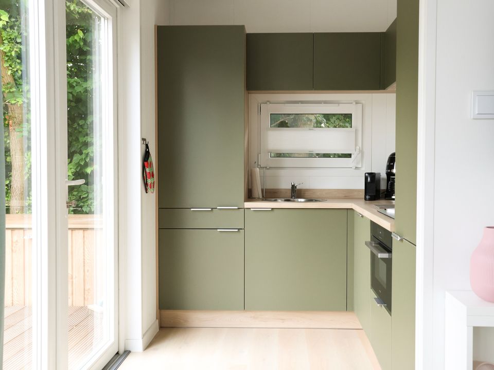 De badkamer beschikt over een regendouche, toilet en wastafelmeubel met verwarmde spiegel. De woonruimte is knus en heeft een aparte zit- en eethoek met een heerlijke loungebank en ronde eettafel.