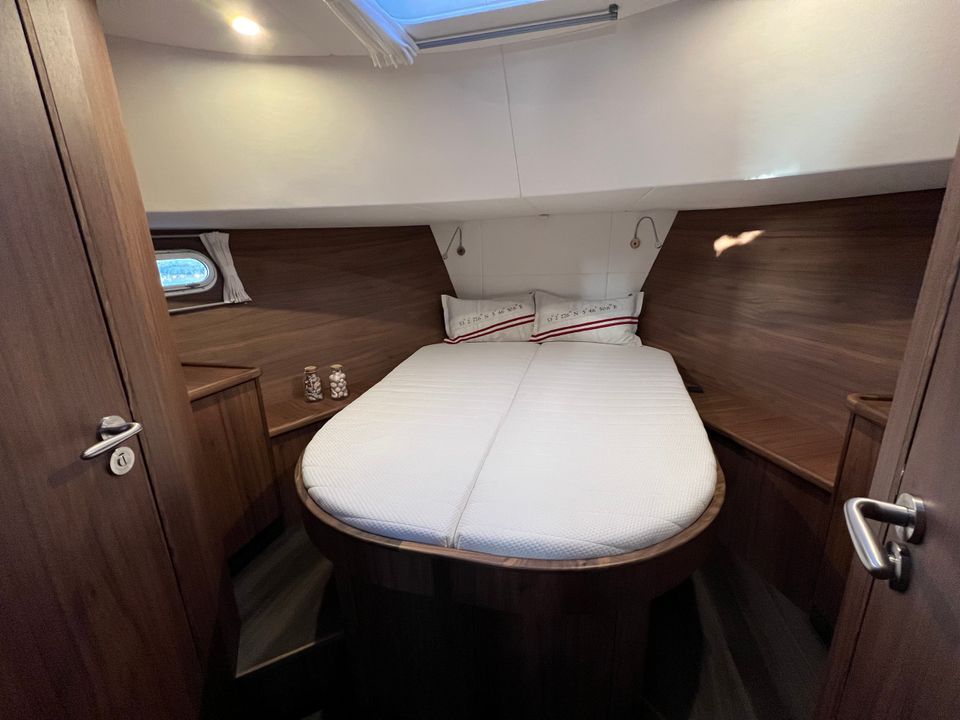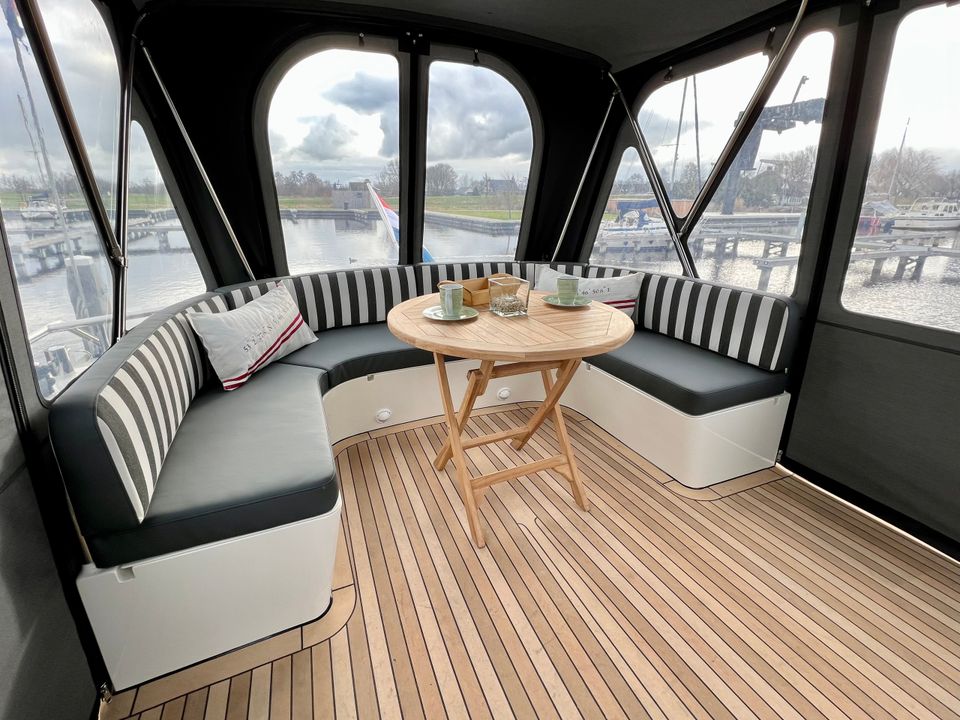Buiten geniet je op het achterdek van een vaste U-bank met opbergruimte voor twee vouwfietsen, verwarming, een XL-cabriotent, windscherm, stuurstand met GPS-kaartplotter en een zonnepaneel voor extra stroomonafhankelijkheid. Via een led-verlichte trap bereik je het zwemplateau met opklapbare zwemtrap.