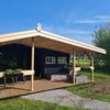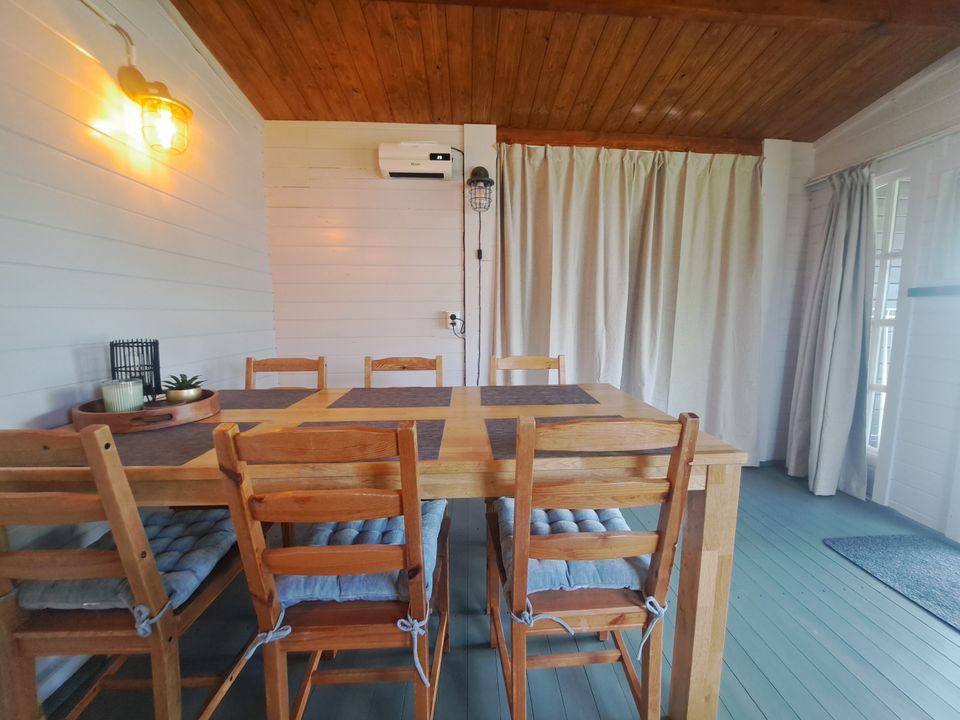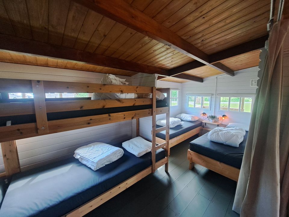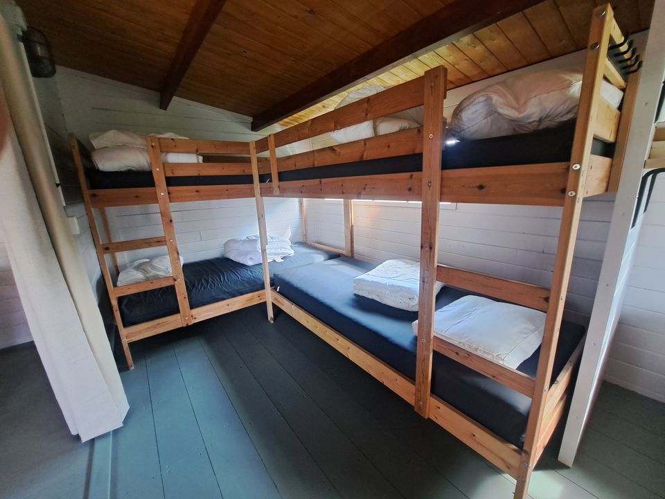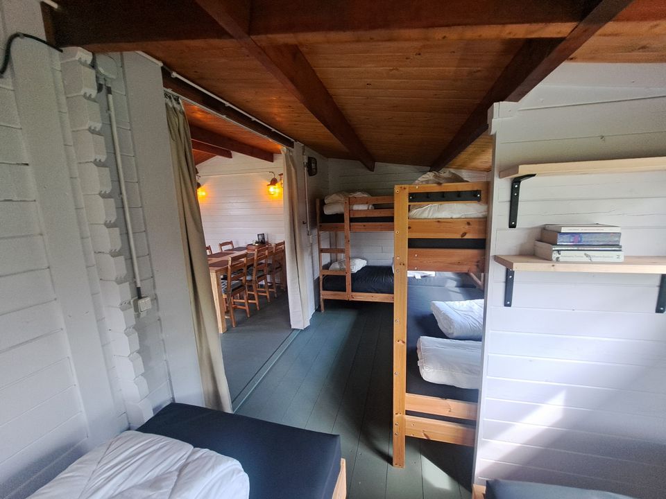 Een mooie en gezellige blokhut voor maximaal 6 personen. Als u binnenloopt zit er aan de linker kant een keukentje met kooktoestel, keukengerei, bestek en porselein inbegrepen, koffiezetapparaat (Dolce Gusto), koelkast en inductie kookplaat voor extra gemak. Ook staat er een eettafel wat meer aan de linker kant. In de blokhut zitten 2 eenpersoons bedden en 2 stapelbedden. Deze accommodatie heeft een overdekt terras dus ook met regenachtig weer kunt u genieten van de buitenlucht. Het sanitair gebouw is vlakbij de blokhut. U dient zelf mee te nemen: Onderlaken, dekbedovertrek en kussensloop.