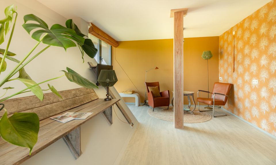 Het appartement ligt op de eerste etage en voelt licht en ruim door de schuine wanden en grote ramen. De open indeling combineert slapen en relaxed zitten in één ruimte met een rustige en eigentijdse inrichting.