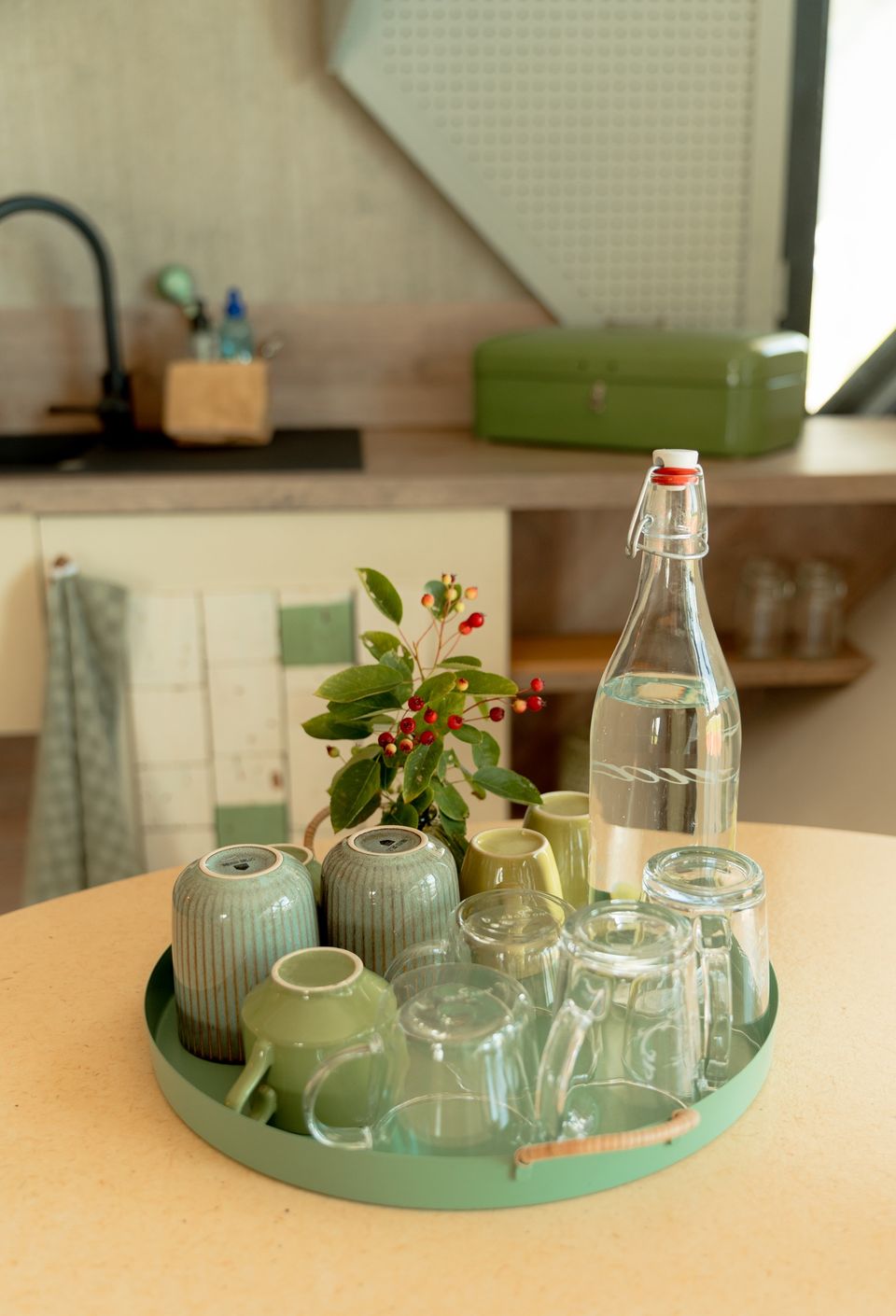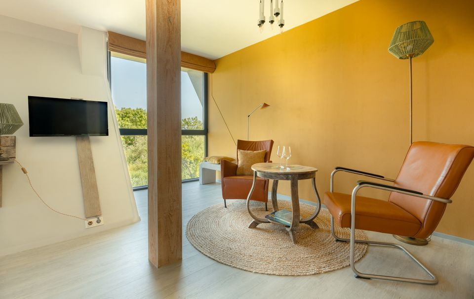 Er is een comfortabel tweepersoonsbed, een zithoek met twee fauteuils en een draaibare smart tv. De pantry keuken is compleet ingericht met koelkast, combimagnetron en koffie en theefaciliteiten. De badkamer heeft een douche en toilet.