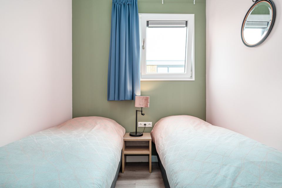 Deze 4-persoons vakantielodge bestaat uit 3 kamers waarvan 2 slaapkamers. De slaapkamers zijn voorzien van 2 eenpersoonsbedden. Daarnaast is de vakantielodge voorzien van een woonkamer met grote raampartijen en complete keuken. De badkamer is voorzien van een douche, toilet en wasbak.
