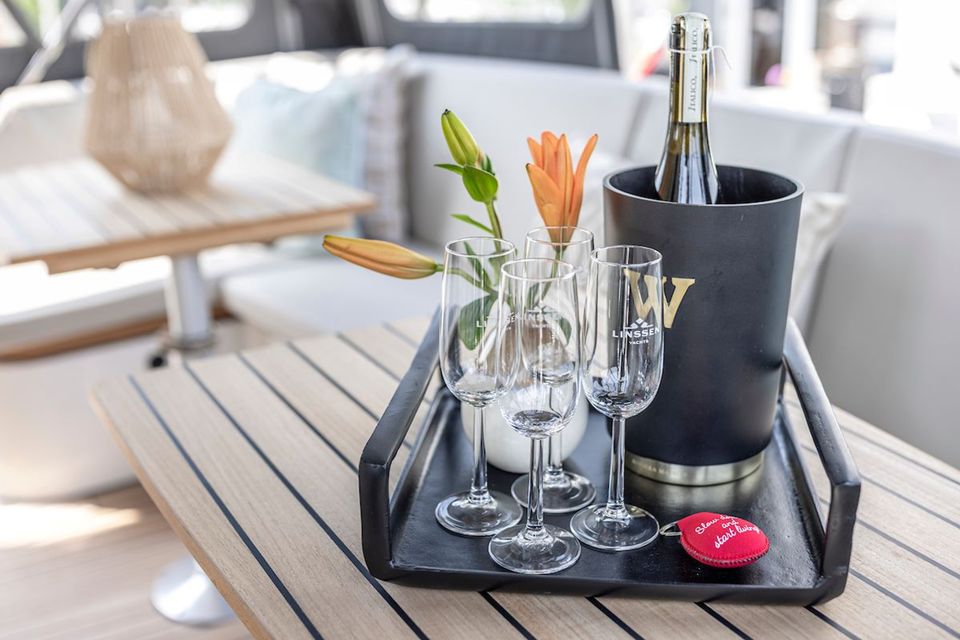 Benedendeks zijn twee royale 2-persoons slaaphutten, twee badkamers, twee toiletten. En nog een extra derde hut met 2 1-persoonbedden. Een compleet uitgeruste keuken, met combi-oven, vaatwasser, inductiekookplaat en een geintegreerde luxe espressomachine maken de luxe beleving compleet. De Blue Sky is uitgerust met een airco-systeem.