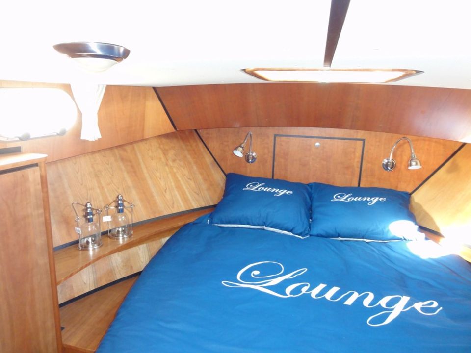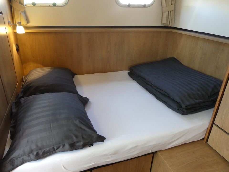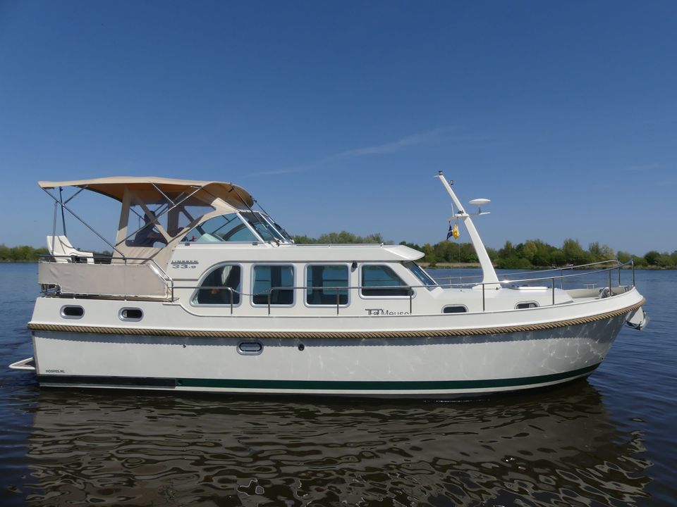 Linssen Grand Sturdy 33.9 AC 'La Meuse' huren? Deze luxe en compleet uitgeruste motorboot huur je voor vier personen (met de mogelijkheid tot twee extra slaapplaatsen). Dit type is uitgevoerd met een stuurstand op het dek. Vanaf dit dek met rondom glas is het heerlijk varen en heb je altijd genoeg zicht op het water. Het schip vaart stil en de rust en ruimte van de prachtige Friese natuur geven jou die ultieme vakantiebeleving! De luxe tent kun je verstellen naar inzicht en pas je aan naar het actuele weer. Bij erg warm weer zorgt de extra bimini voor comfort en schaduw. Aan boord heb je veel ruimte én privacy door de twee separate slaapvertrekken met eigen sanitair. Deze comfortabele motorboot beschikt over perfecte vaareigenschappen en is uitgerust met snelheids- en dieptemeter op het Log/kaartplotter. De boegschroef helpt een handje bij het aanmeren, wegvaren of manoeuvreren op smalle wateren. Vanaf de kapiteinsstoel bedien je deze Linssen Grand Sturdy 33.9 met gemak. De mooiste vaarroutes en waterkaarten liggen aan boord voor je klaar. Het schip heeft zowel 12 Volt als een 220 Volt aansluiting, je kunt onderweg dus altijd over stroom beschikken. De walstroomaansluiting gebruik je wanneer je aangelegd hebt in een van de vele havens die Friesland en Nederland rijk is. Door de heteluchtverwarming is het aangenaam vertoeven en kun je ook met minder mooi weer blijven doorvaren en genieten. Uiteraard zijn radio en LCD-televisie met Digitenne in HD-kwaliteit aanwezig. De radio speakers bevinden zich ook buiten in op het dek. Via het dek komt je op het zwemplateau. Daar bevindt zich tevens een (buiten)douche met warm en koud water.