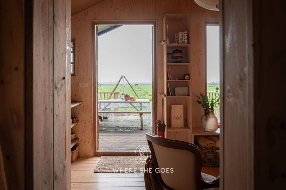 De hut biedt plaats aan 2 tot 4 personen en heeft een prachtig uitzicht door een groot raam op de natuur, met een houtkachel voor warmte. Hij is licht en heeft veel karakter, met een comfortabel bed en een stapelbedstee. In de tent is een toilet met wastafel aanwezig. In het keukentje een inductie kookplaatje om te koken, een koffieperculator en koud water. Er is stroom aanwezig. Een prive "'unieke'' buitendouche beleving met verwarmd water. je mag ook gebruik maken van de douches in het hoofgebouw. Het is een unieke mix van een huisje en een tent, waarbij je profiteert van de voordelen van een tent, zoals het luisteren naar de geluiden van de natuur, terwijl de onderkant van hout is, waardoor je geen last hebt van tocht. Bovendien zorgt de houtkachel voor een aangename warmte en in de winter/herfstperiode verwarmde bedden. Ook heeft de hut mooie authentieke openslaande deuren. Een grote vlonder met luifel en optioneel is een hottub mogelijk. Je kunt ook buiten koken op openvuur en een kampvuurtje maken. Heerlijk toch! Hier wordt het nog echt donker en kun je sterren kijken.
