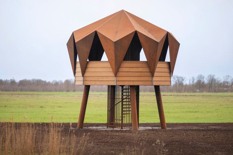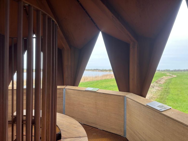 Deze nieuwe 8 meter hoge uitkijktoren is een unieke combinatie van een uitkijktoren en een vogelkijkhut. Je kunt hier kijken en genieten zonder te verstoren!