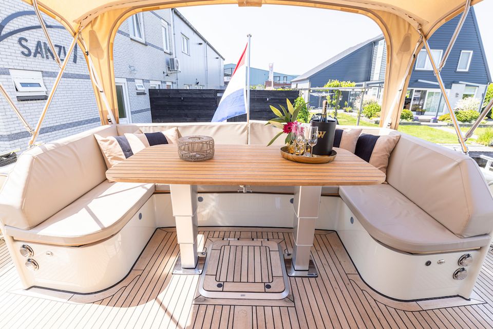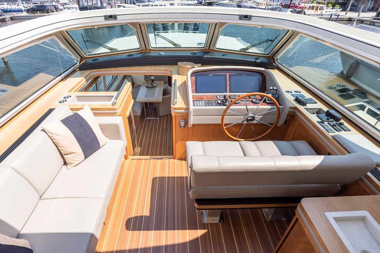 In het stuurhuis is het dashboard voorzien van alle denkbare navigatietools en boven de stuurbank is de Variotop welke elektrisch bedienbaar is. In het stuurhuis is ruim zitplaats en tevens is daar een klein keukentje met een extra koelkast. Dit gedeelte van het het schip is geheel afsluitbaar met solide deuren en verwarmbaar. Verder is op het achterdek een royale zitbank met een in hoogte verstelbare tafel welke eenvoudig tot een loungebed te maken is.. Ook dit deel, het achterdek, is geheel afsluitbaar met een cabriokap( staat niet op de foto's) Het badplatform is verlengd en is verzinkbaar, zodat het zwemmen nog een groter plezier wordt!