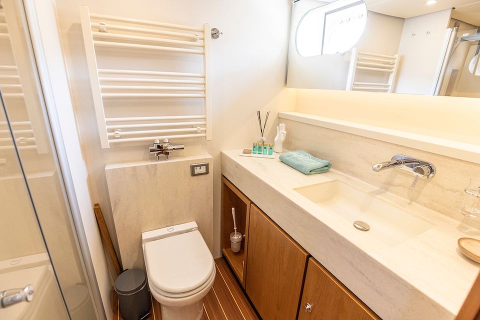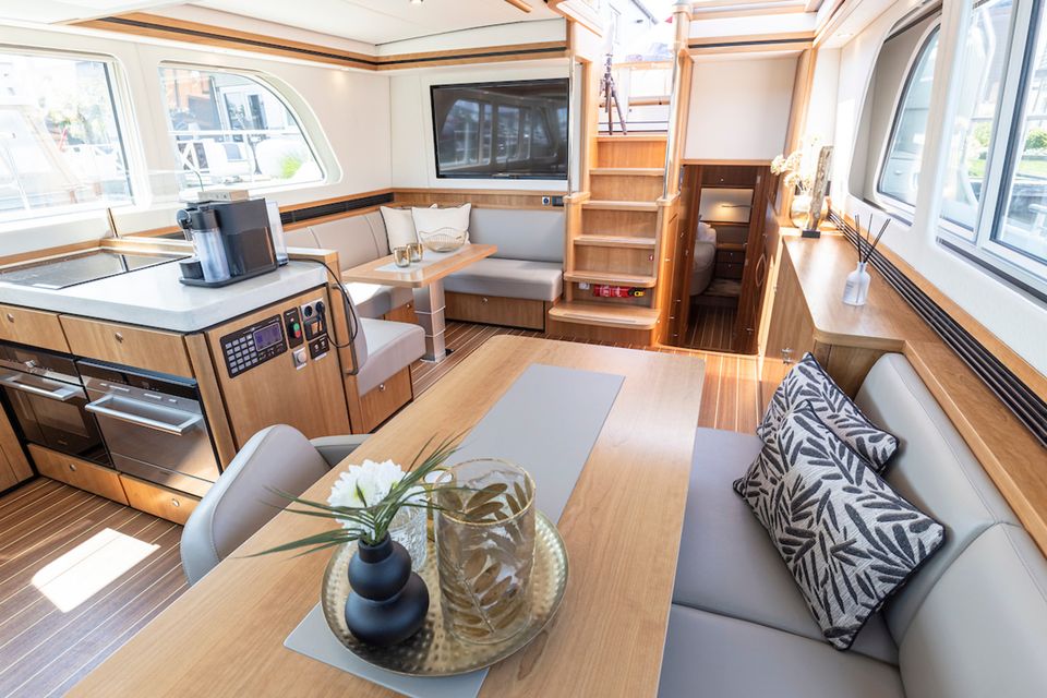 De indeling is uitermate geschikt voor 4-6 +2 personen. Benedendeks zijn drie royale 2-persoons slaaphutten, twee badkamers, twee toiletten. De salonbank is met een handeling in te richten als een extra twee-persoonsbed.