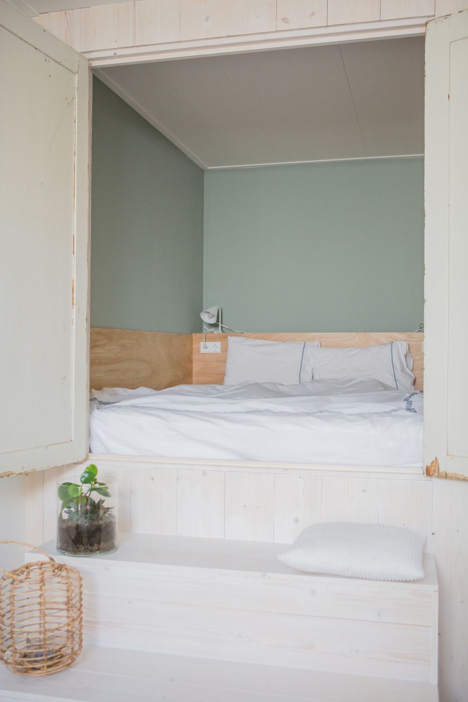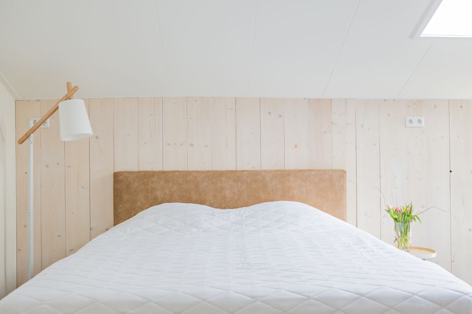 Lichte zolderkamer op de voormalige hooizolder van de boerderij. Door het tunnelraam kijk je uit over de weilanden. Je hebt de beschikking over een ruime kamer met tweepersoonsbed en aparte bedstee voor een evt. derde gast. Ook is er een privé badkamer met toilet, douche en wastafel aanwezig. Je kunt gebruikmaken van de open keuken in de hal op de begane grond (met vaatwasser, koelkast, kookplaat, oven, koffiemachine en waterkoker). Achter de boerderij kun je buiten op het terras zitten. Vanwege de ligging op de eerste etage is deze kamer niet geschikt voor kleine kinderen, huisdieren en mindervaliden.