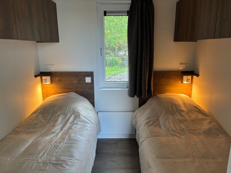 Voel je direct thuis in één van de chalets op de Markestee. Met een vaste luifel en terras, toegankelijk via openslaande tuindeuren, biedt de accommodatie volop ruimte. Er zijn drie slaapkamers beschikbaar: één met een tweepersoonsbed, één met twee eenpersoonsbedden, en een derde kamer met een stapelbed.
