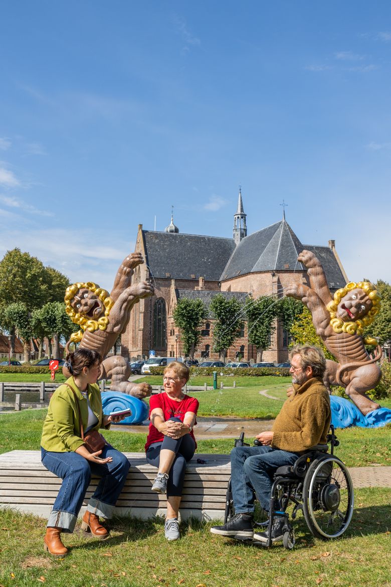 Jannie raakt de arm van Gerben kort aan. “Nou, ik denk dat jij er inmiddels meer van weet dan ik!” Gerben glimlacht en durft de uitdaging aan. “De leeuwen komen dus uit het wapen van Workum,” begint hij. “Maar in het wapen dragen ze een schild tussen zich in. Dat schild is hier weggelaten, waardoor je tussen de leeuwen door kunt kijken. En zo vormen ze een boogje, of een lijst naar de grote kerk erachter. Ze leiden als het ware de blik van de bezoeker. Het is ook een absolute publiekstrekker.” Jannie: “Ja, het is hier soms smóórdruk. Dan zitten de bankjes hier helemaal vol met moeders.” Gerben: “Ik zie hier zelfs vrijgezellenfeestjes komen.” Jannie: “Ja, en laatst een mountainbiketocht. Iedereen moest er even onderdoor fietsen. Leuk is dat hoor.”