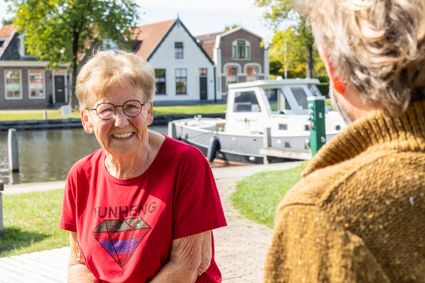 Dan gebaart Jannie naar het manshoge riet dat tussen de bankjes, het water en de huizen staat. Ze grinnikt: “Maar ze zijn dus hier gekomen, en het riet is nu mooi hoog, dus dan zie ik ze niet. Ik zie alleen de koppen erbovenuit steken. Nee, ik vind ze absoluut niet mooi, hoor. Maar ik ben wel vreselijk blij met alles wat eromheen gebeurt.”