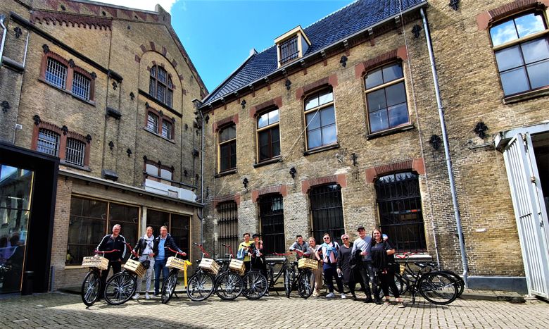 We verzamelen op het 1e plein van de Blokhuispoort. Hier heet onze gids jullie van harte welkom en na een korte introductie ontvangt iedereen een retrocoole fiets met handig fietskratje voor jas en tas.